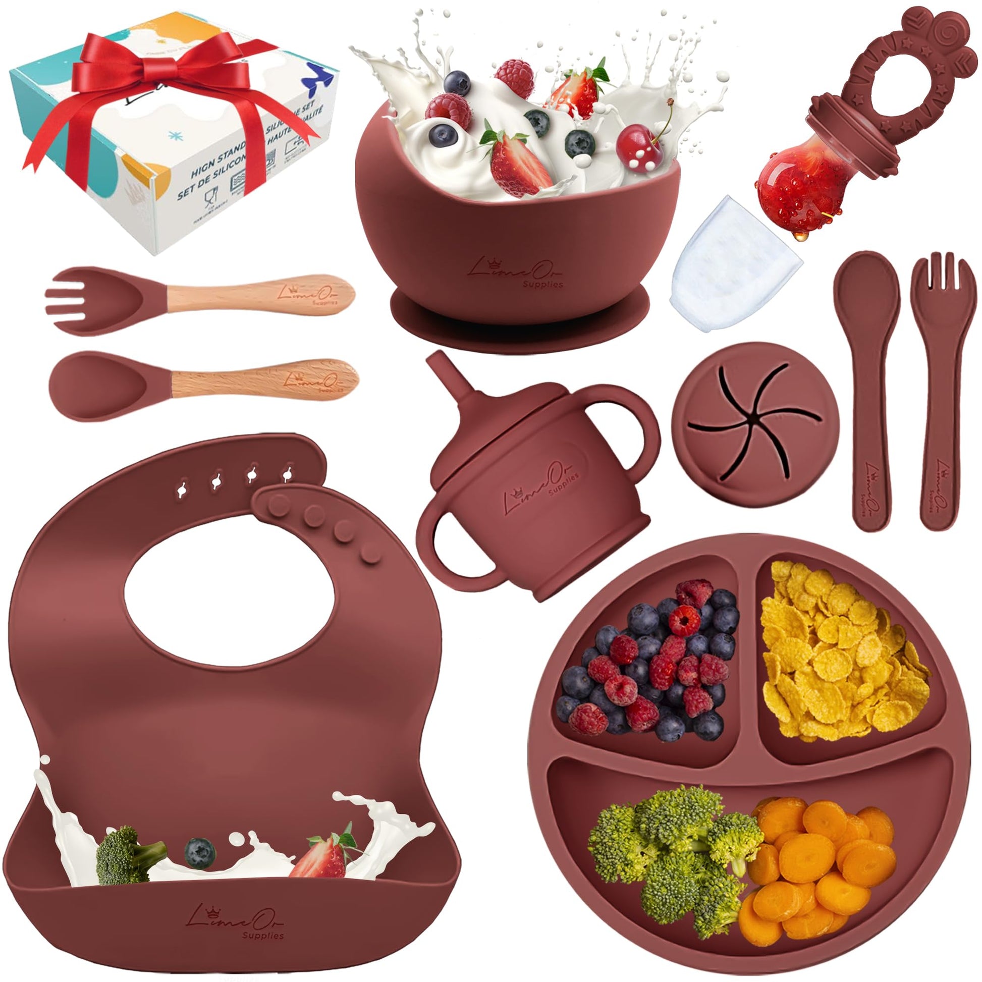- Complete 10-Piece Silicone feeding set for baby – Our 10-piece Baby led weaning set includes everything your little one needs to start their self-feeding journey: 1x silicone suction plate baby, 1x suction bowl, 1x training cup with straw & lid, 1x baby bib with catcher, 1x beginner toddler fork, 1x beginner toddler spoon, 1x wooden feeding fork, 1x wooden feeding spoon and 1x fruit feeder. Crafted to grow with your baby, this set is ideal for baby solids starter kit and ensures mess-free mealtimes.