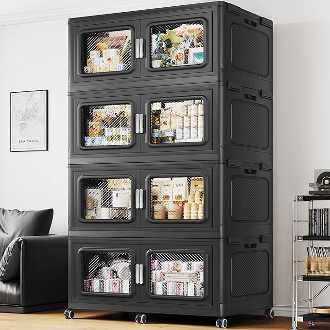 - The stackable storage bins open front feature a special groove design that allow for stacking multiple layers of plastic drawers.With 2 side buckles and 1 rear buckle making bins more study. Also, the large stackable storage bin equipped with 6 pcs 360° rotating wheels with TPR coating, allowing for easy movement, keeping your room tidy and organized