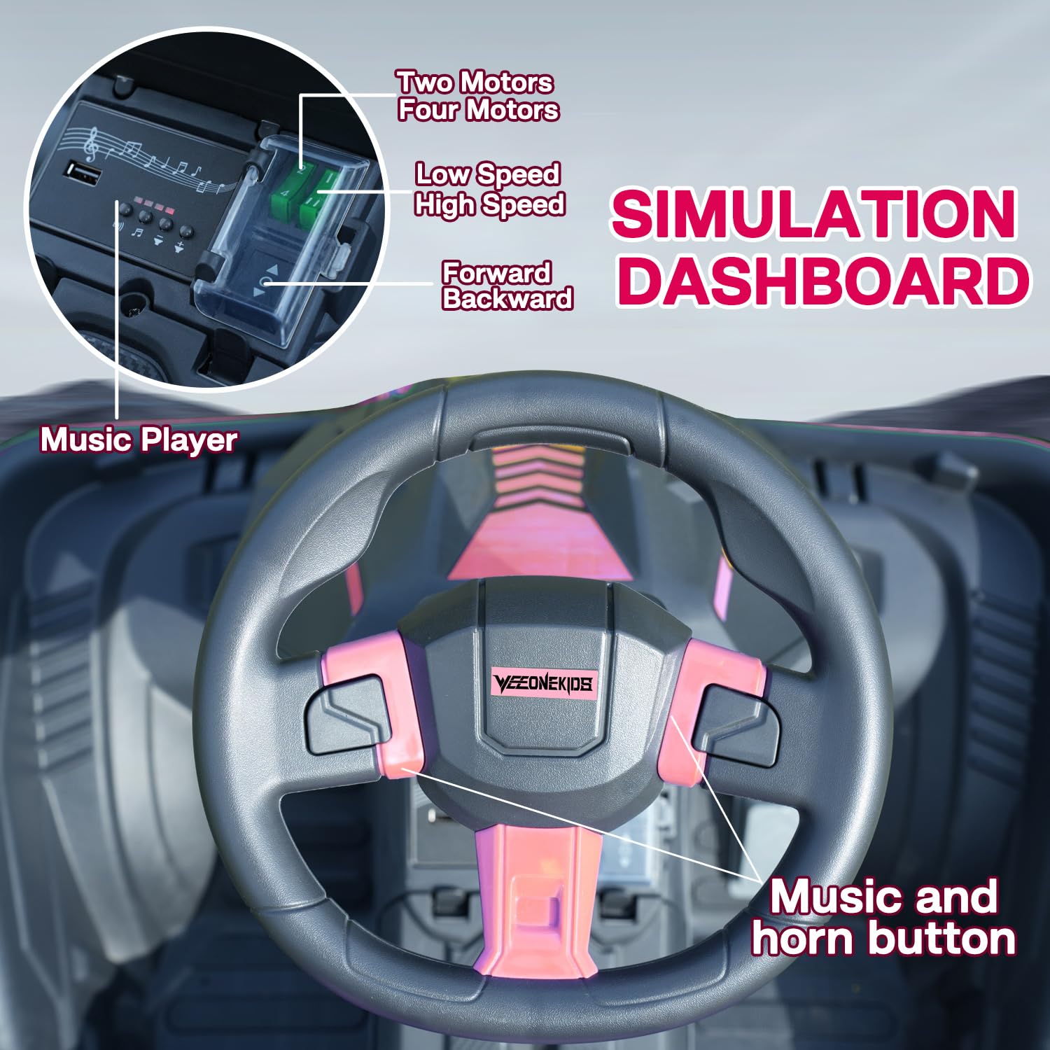 - Adjustable Seat: The seat can be adjusted back and forth with 3 different positions for children to have a more comfortable riding experience. This kids 24v ride on allows your child to sit comfortably and stretch his/her legs freely.