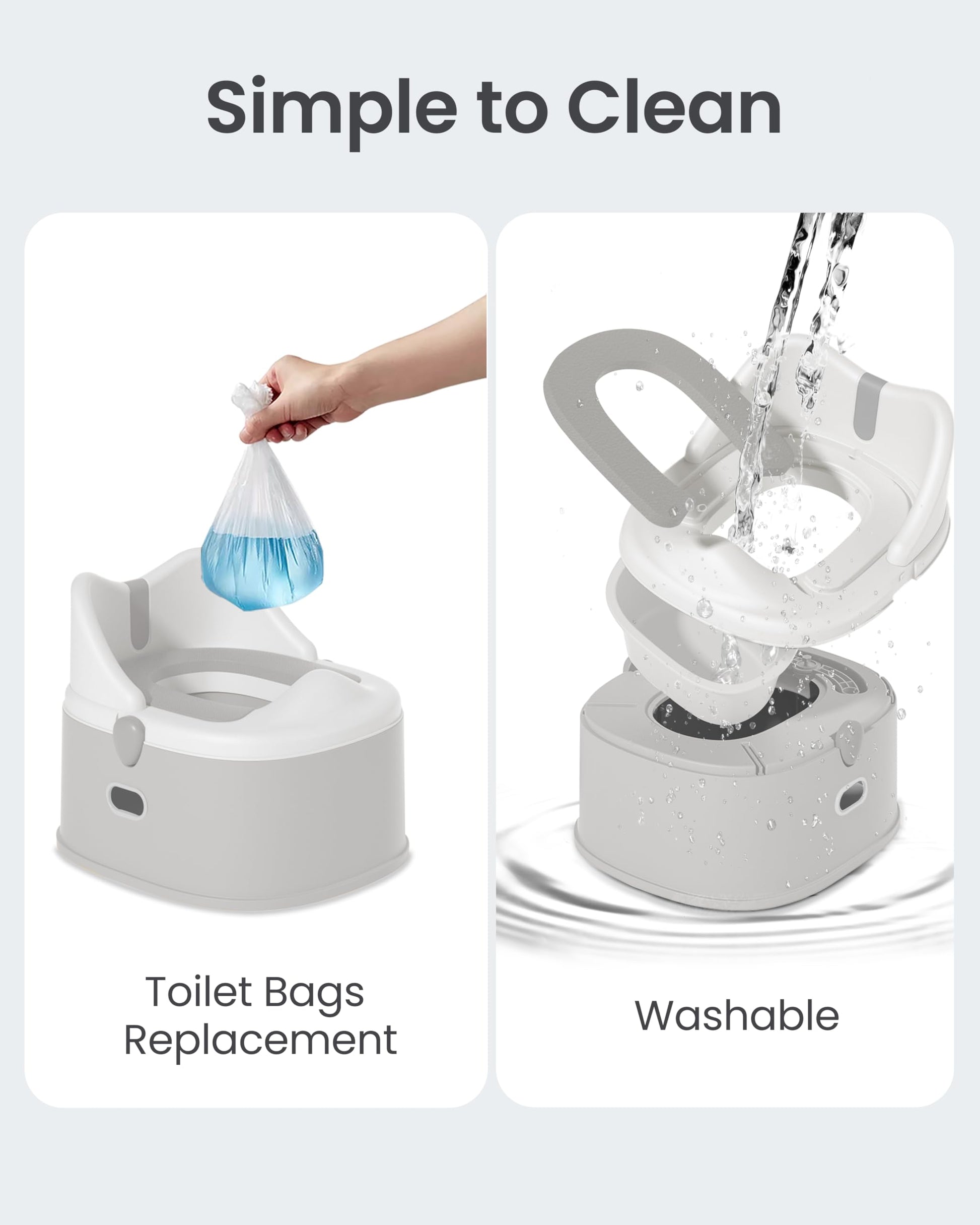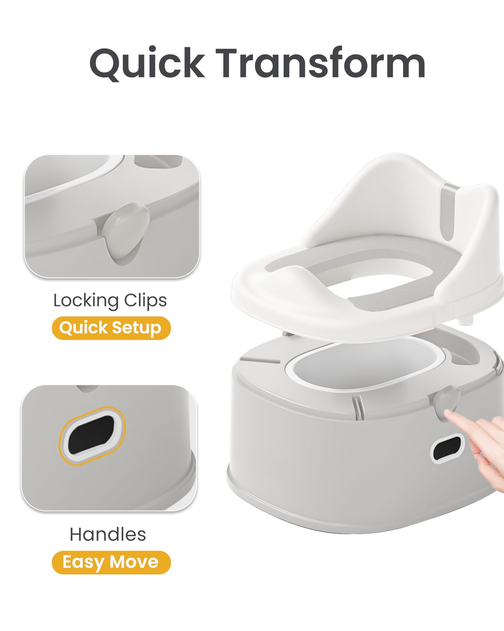 - 【EASY TO SETUP & REMOVE】 With a snap-on buckle design, just one press, this toddler potty quickly transforms into a seat and step stool, making installation and removal effortless. The top and bottom stay securely together during transport, and the two side handles make moving the potty convenient and hassle-free.