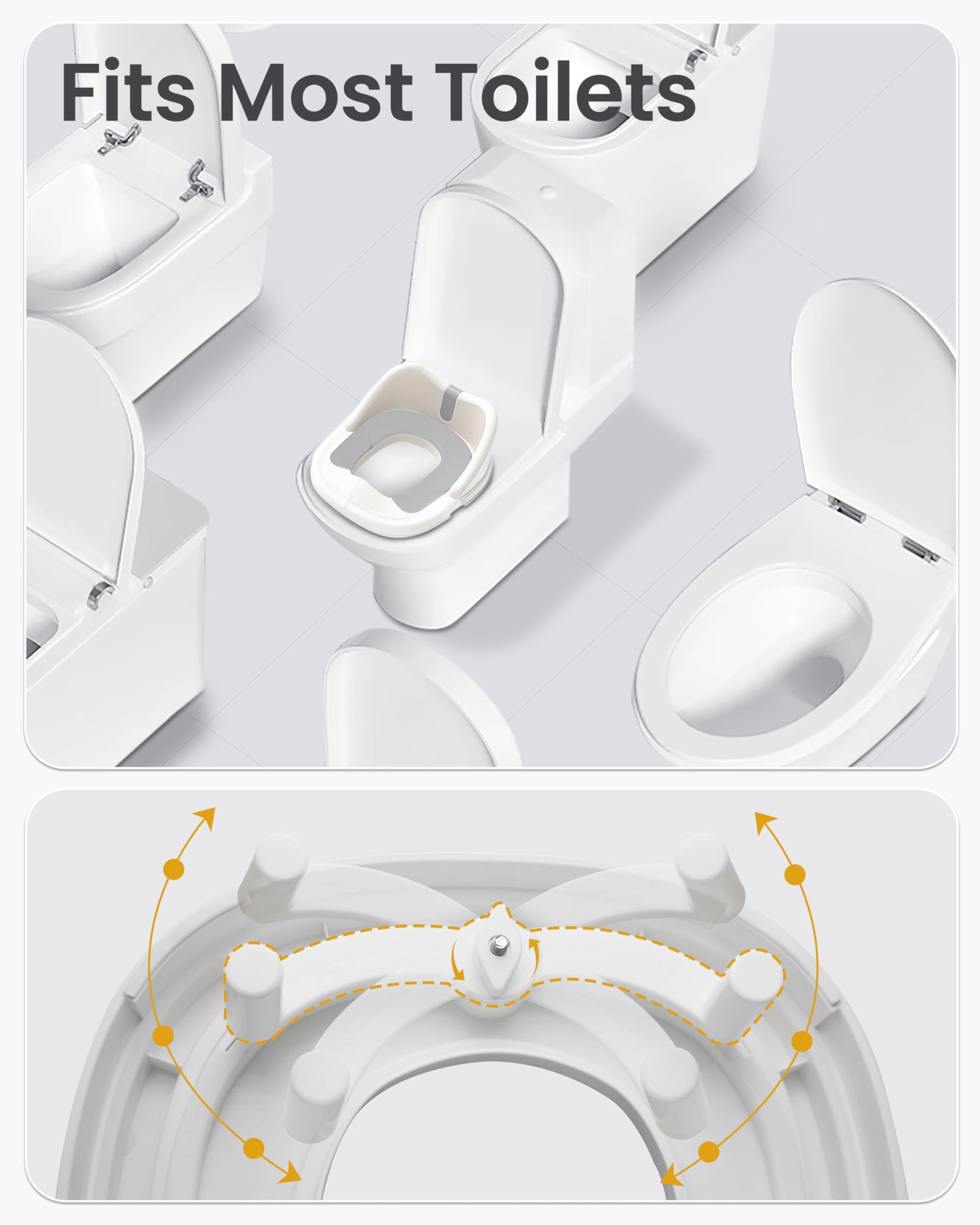 - 【UNIVERSIAL FIT】 Equipped with an adjustable lever, this training potty is compatible with most standard toilets. This baby potty is perfect not only for home use, but also incredibly compact and portable, easy to disassemble and ideal for travel use. Buy with confidence!