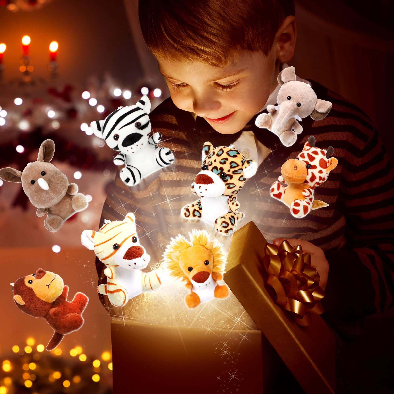 - Vivid Stuffed Jungle Animals: 48 soft safari animal plush toys in a wild animal theme to spark imaginative play; These suede like animals are way too cute, each character is in the shape of a favorite zoo animal: lion, tiger, elephant, giraffe, leopard, monkey, white tiger, rhino and more, giving one of these cuddly plush creatures to each guest at your next safari party
