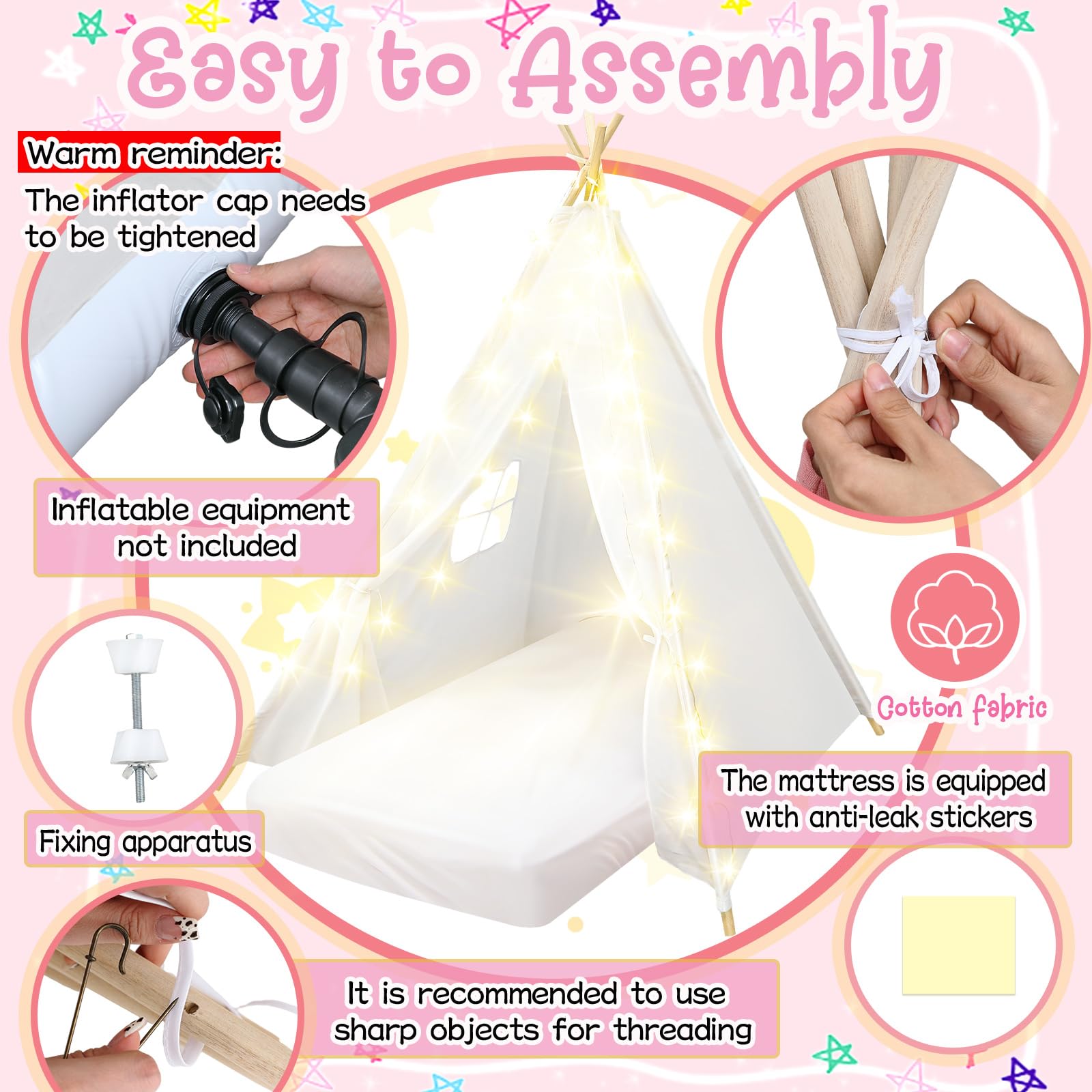 - Sturdy & Durable: made from quality cotton fabric, our machine-washable kids tent indoor is supported by solid pine poles for stability; The flocked air mattress inflates quickly, while the fitted sheet and star lights add extra comfort and charm