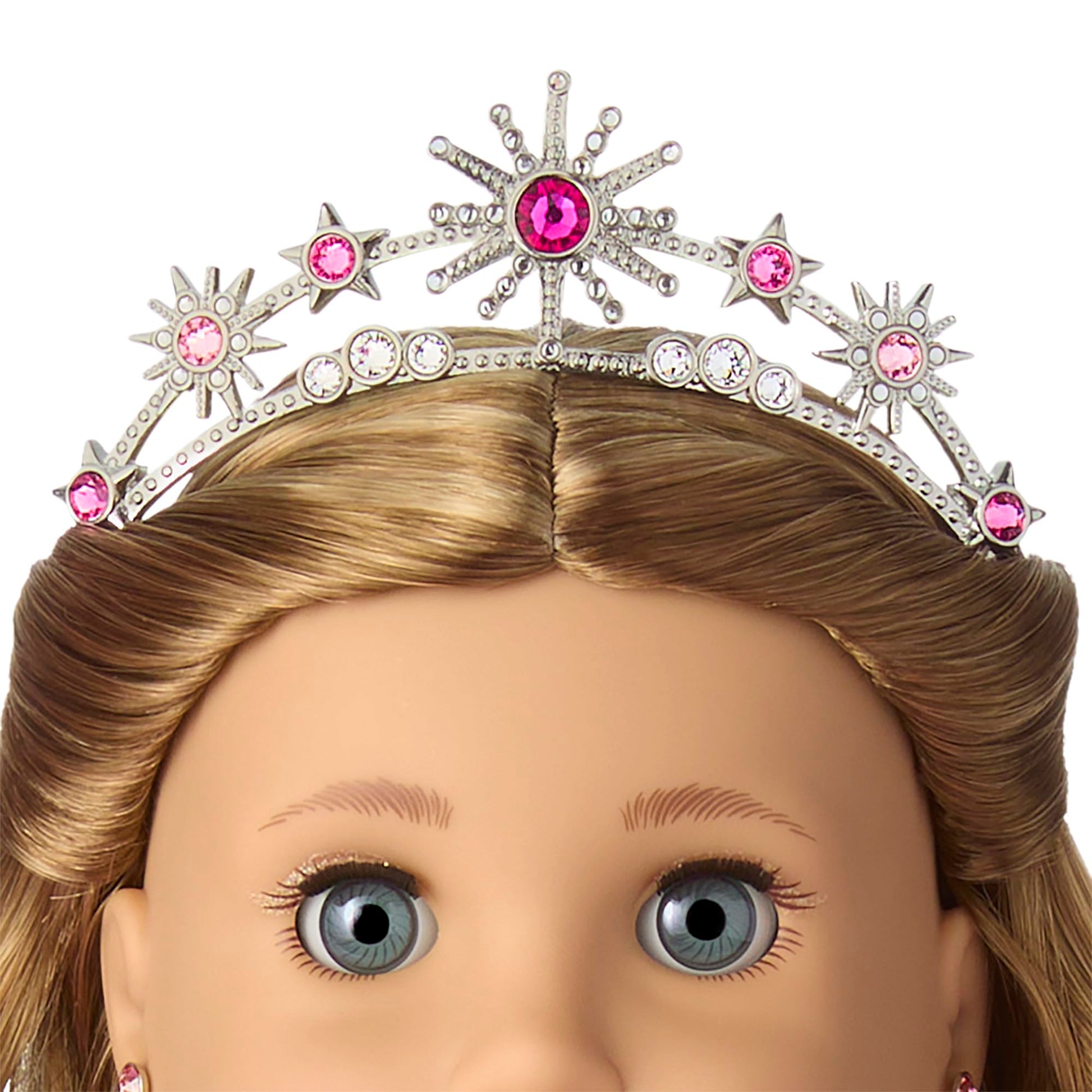 - A silver metal headband with starbursts and stars accented with pink, fuchsia, and clear Swarovski crystals, a silver metal star necklace with Swarovski crystal center, a silvery metal bracelet embellished with pink Swarovski crystals, and a pair of glittery pink kitten heels with a silver star charms with fuchsia Swarovski crystal centers on the toes