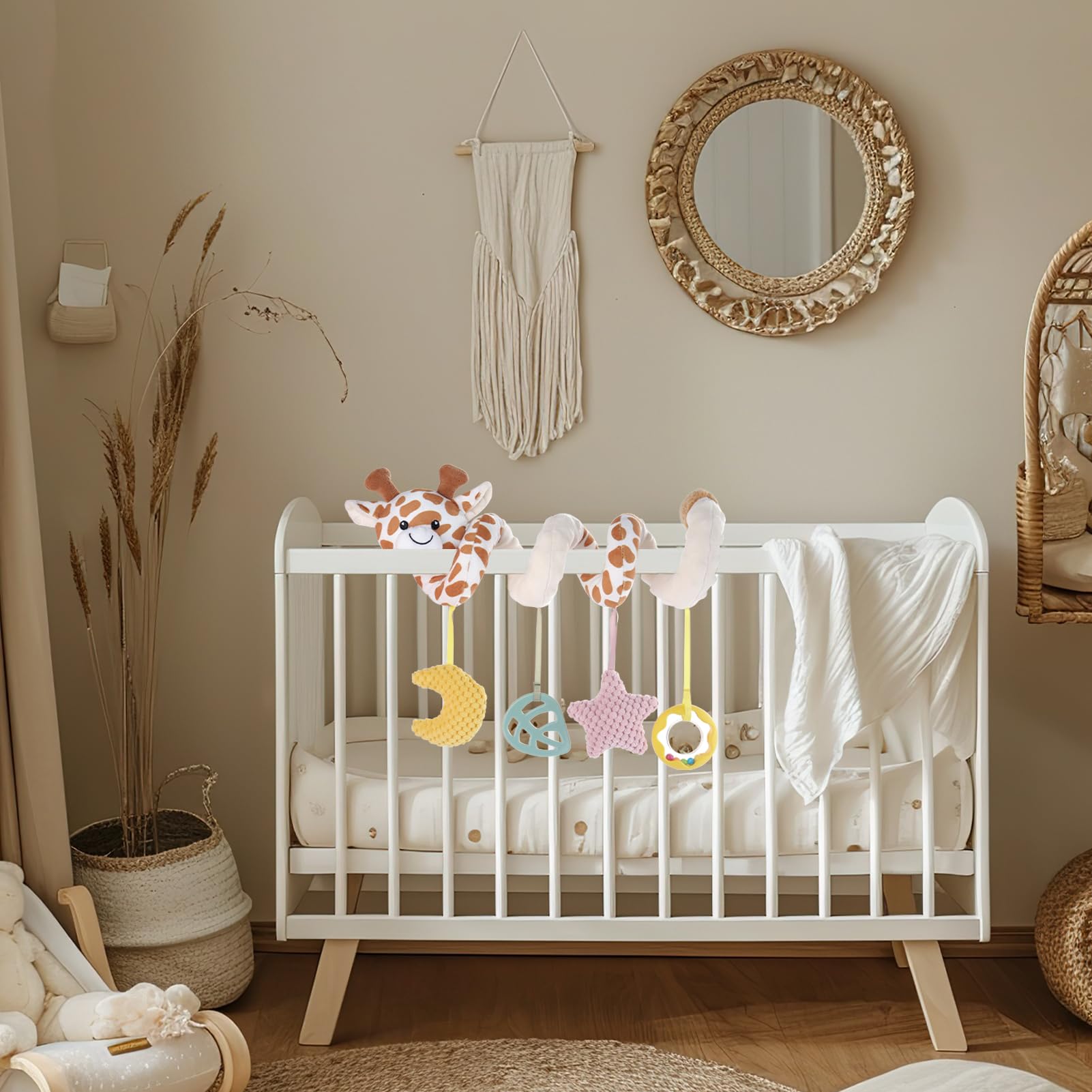 - Perfect Size : The cute plush animal shape giraffe spiral activity toy is 26 inch in length. Includes 4 hanging toys that provide sensory interaction. Easily attach this wrap-around spiral to a stroller bar for on-the-go fun.