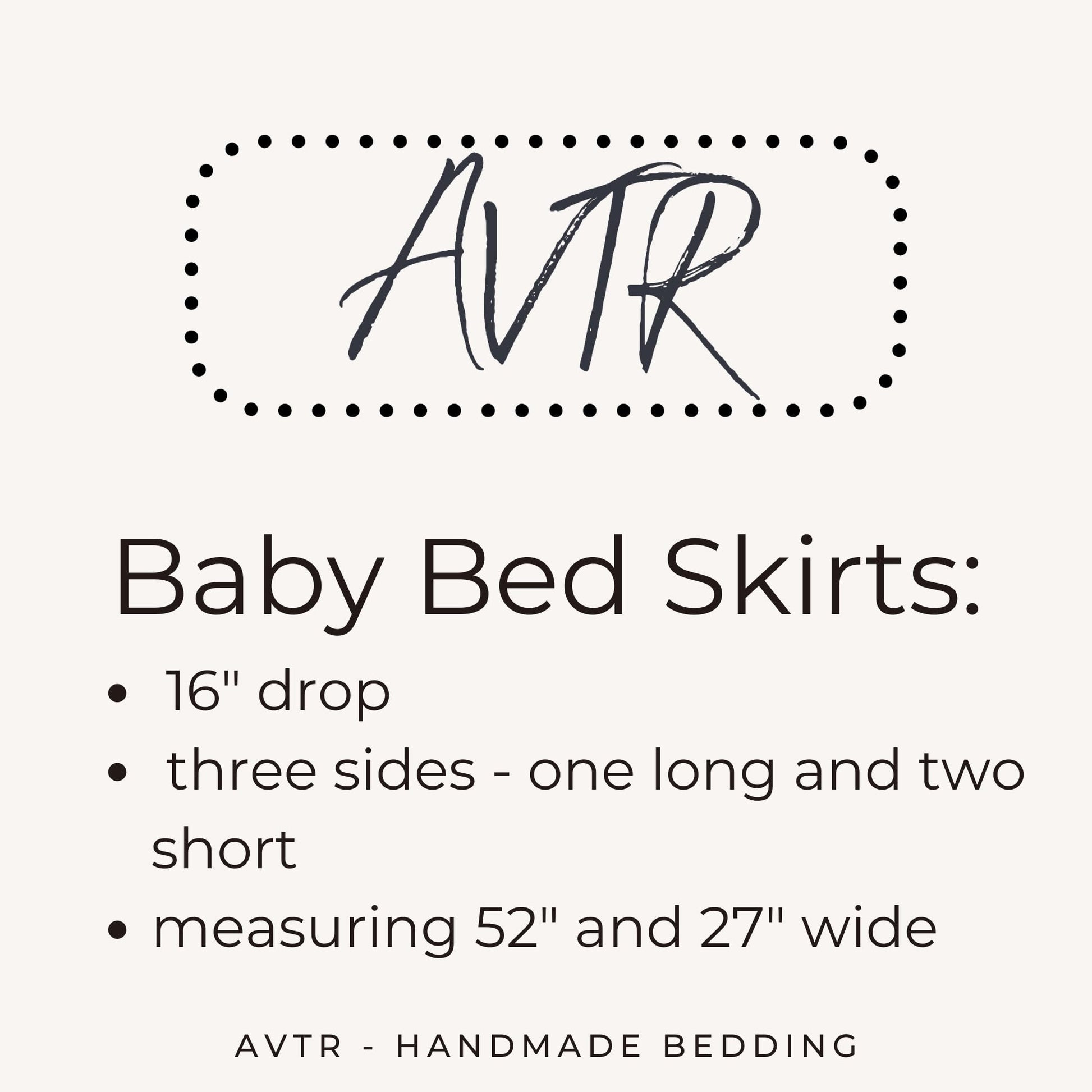 - Extra long drop at 16 inches. Fits standard size cribs at 27 inches by 52 inches wide.