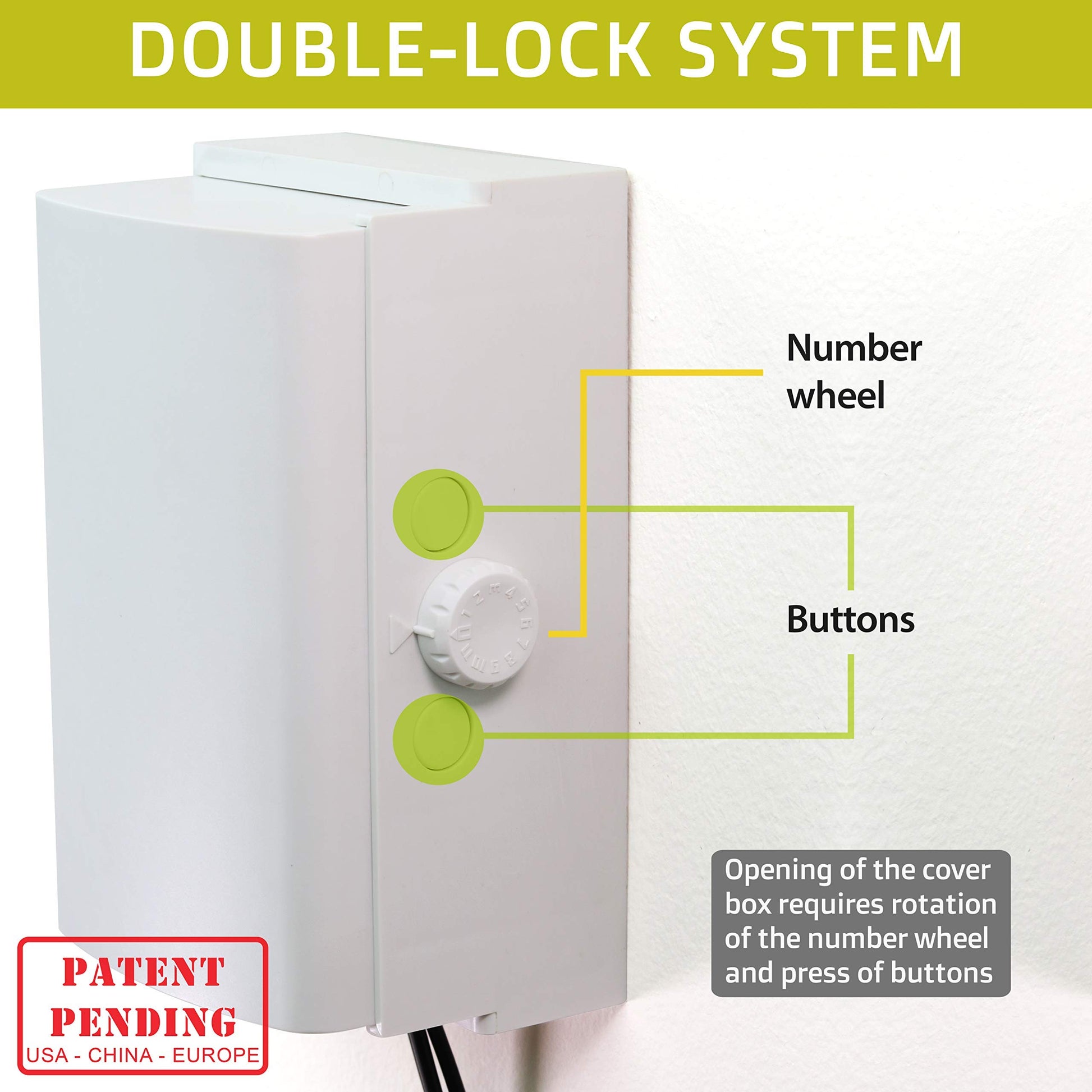 - IMPROVED OUTLET COVER SAFETY BOX designed to enhance peace of mind. Your baby or toddler is far less likely to experience an accident or injury. This box uses an ingenious double lock mechanism that's very easy for adults to open, yet difficult for a toddler to use. Smooth, fast, effortless one hand open for parents, grandparents, sitters.
