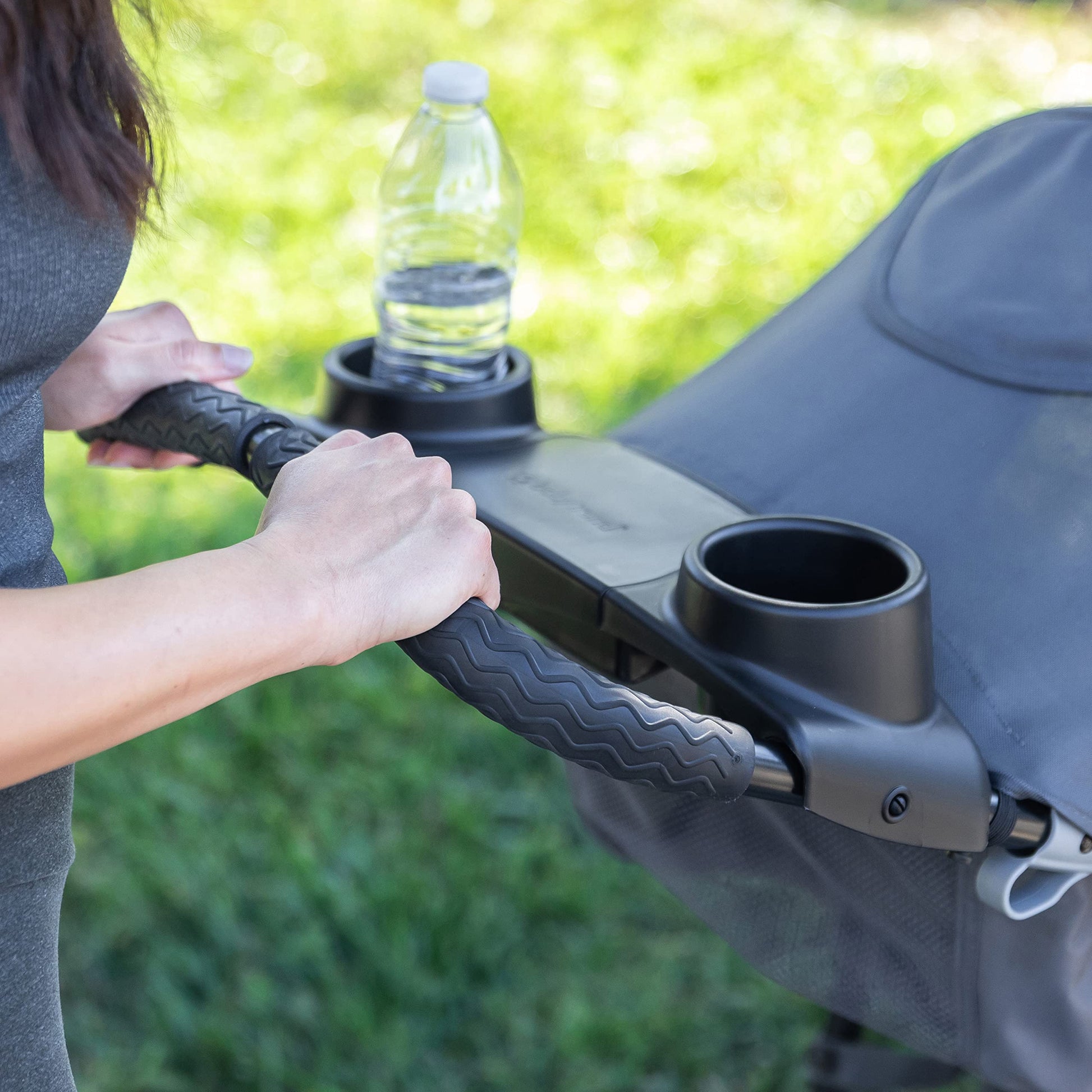 - Convenient parent tray includes two cup holders and covered compartment storage; Child's tray with two cup holders