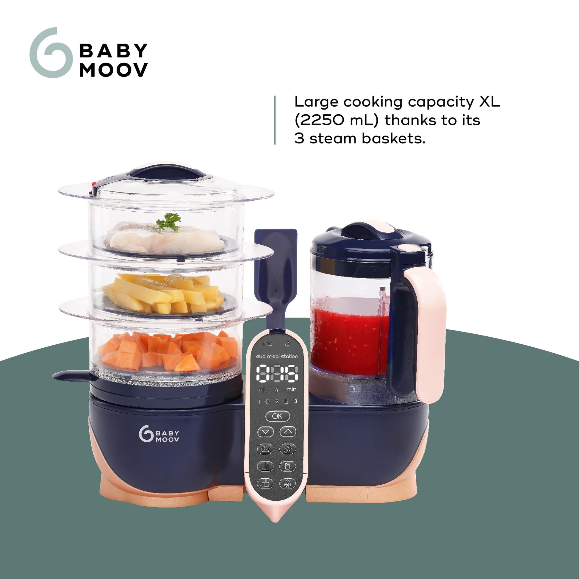 Cooking ingredients separately is the secret to healthy and tasty cuisine. With Duo meal station XL, ingredients are cooked separately: All you need to do is start cooking the foods that need to cook for the longest time in the 1st basket, then add the other ingredients to the 2nd basket a few minutes before the end of the cycle. A 3rd steaming basket can be added for additional ingredients or combined with the other trays to increase capacity. Accordingly, each ingredient is cooked the right amount of time and baby benefits from all the vitamins and enjoys the best flavors. Biggest capacity on the market with a capacity of 12 cups to cook for several days or for the whole family. Duo meal station is saving you time in the kitchen and giving you more time to hang out with your little ones. The only baby food processor with 6 different functions: steam, blend, sterilizes (up to 3 full size BOTTLES), defrosts, reheats and warms bottles. All the functions are easily managed thanks to its LCD screen. Since it sterilizes and warms bottles Duo meal station XL can be used from birth, and this makes it a baby registry essential. A cooking spatula is included.