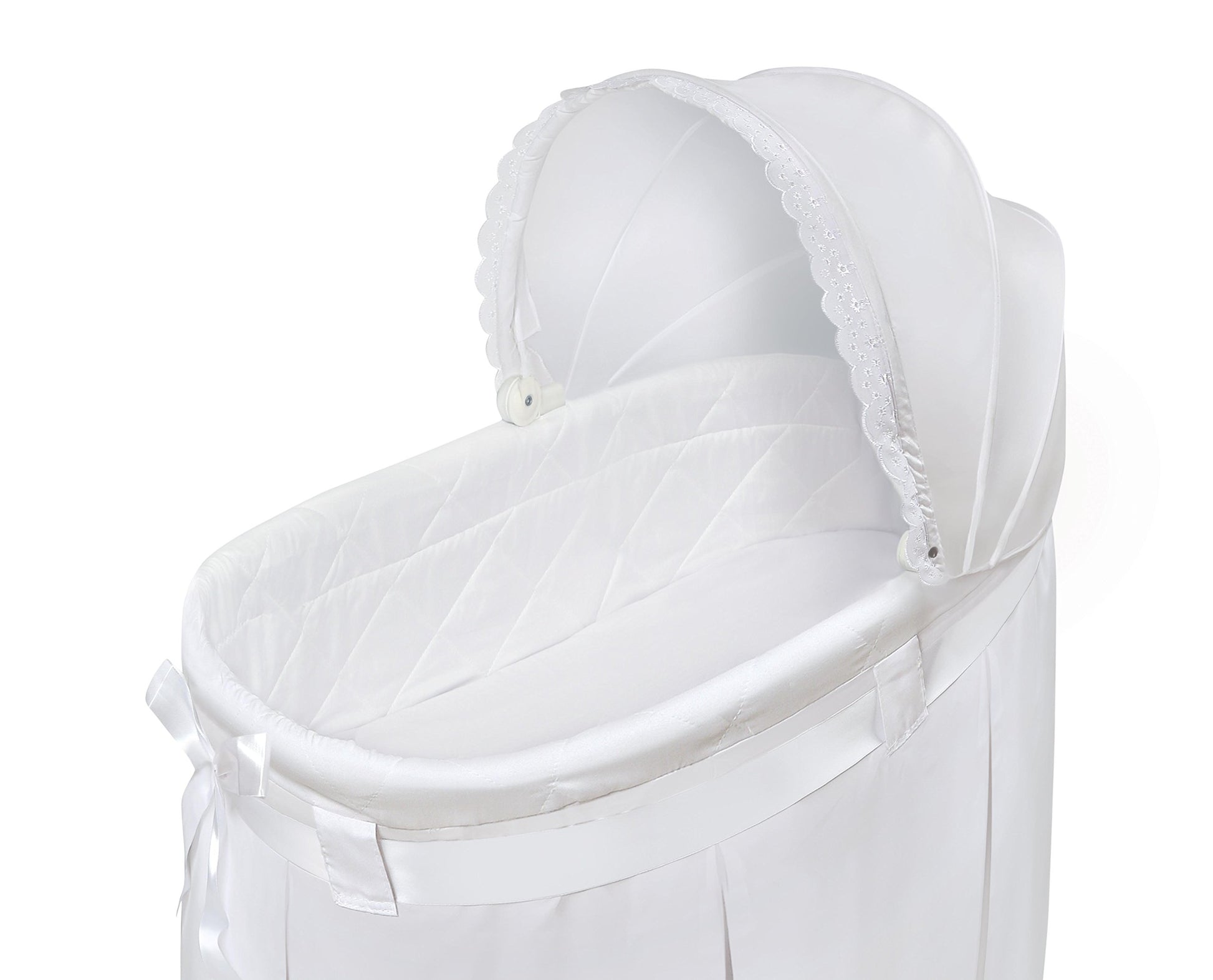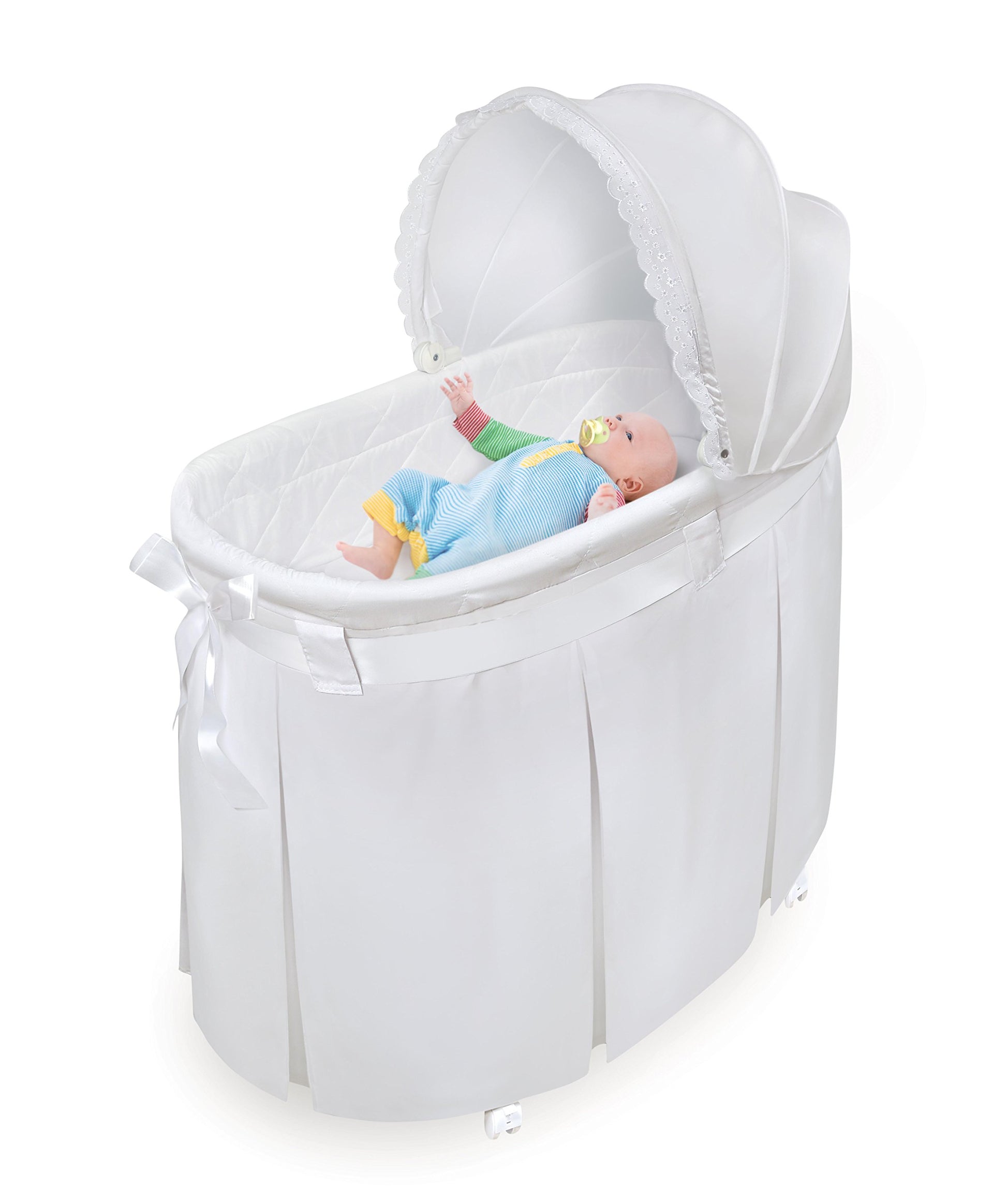 Badger Basket's lovely Wishes Bassinet comes complete with everything your baby needs for the first few months of sleep. Classic, cozy, and comfortable, it features crisp bedding with a floor-length pleated skirt, finished off with a wide ribbon belt tied into a big bow. Generously sized, adjustable canopy completes they stylish look. The hooded, locking caster wheels can be flipped up to rock the bassinet like a cradle! Convert the bassinet to the cradle position easily - no tools needed. Mesh storage basket beneath the bassinet is handy for feeding and diaper changing necessities and toys. Canopy is easily folded down out of the way to tend to your precious bundle inside. Complete bedding set (hood, fitted sheet, and quilted liner/skirt) and foam pad included. White, metal bassinet frame assembles quickly without tools and the bedding is easily attached (and easily unzipped and detached for washing). The long, flowing skirt conceals the mesh storage basket and hides the bassinet stand. White, fitted sheet covers the custom fitted, vinyl-covered-foam pad. Bedding fabric is 100% Polyester. Bassinet is made with powder coated steel metal tubing, PP and ABS plastic, nylon, engineered wood, and PEVA (non-PVC) vinyl, and polyurethane foam. Overall unit (with hood up): 33 inches L x 17 inches W x 41.5 inches H with the wheels down (39 inches with the wheels flipped up in rocking cradle position). Height from the rim of the bassinet to the floor: 28.5 inches H with the wheels down and 26 inches H with the wheels up. Canopy height when fully open: 13 inches H. Base of bassinet (below where baby sleeps): 25.5 inches L x 17 inches W x 19 inches H with the wheels down (16.5 inches H with the wheels flipped up in rocking cradle position). Interior of bassinet measures 32 inches L x 15 inches W x 8.5 inches deep. Foam pad: 32 inches L x 15 inches W x 1 inch H. Mesh storage basket: 18 inches L x 10.5 inches W x 4.5 inches H. There is about 5.5 inches of clearance between top of basket and bottom of bassinet. Assembled product weight: 12.1 pounds. All measurements approximate. All bedding is machine washable (in cold water and gentle cycle). Tumble dry low heat. Iron on low setting no steam if needed. Adult assembly required. No tools needed for assembly. Illustrated instructions included. Bassinet is for use up to 20 lbs. (9.09 kg), 3-4 months, or until Baby can push up, roll over, or sit unassisted (whichever age, weight, or activity limit comes first). In order to comply with current safety standards, the mattress does not exceed 1 inch in thickness. Mesh basket is designed for lightweight items (up to 5 pounds total). Product complies with all currently applicable U.S. safety standards. Product includes a limited warranty of 30 Days Parts to the original purchaser. Product details/features subject to change at any time without notice. Props/accessories shown are for illustration purposes only and are not included with the product. Actual color/finish may vary slightly from screen display. This