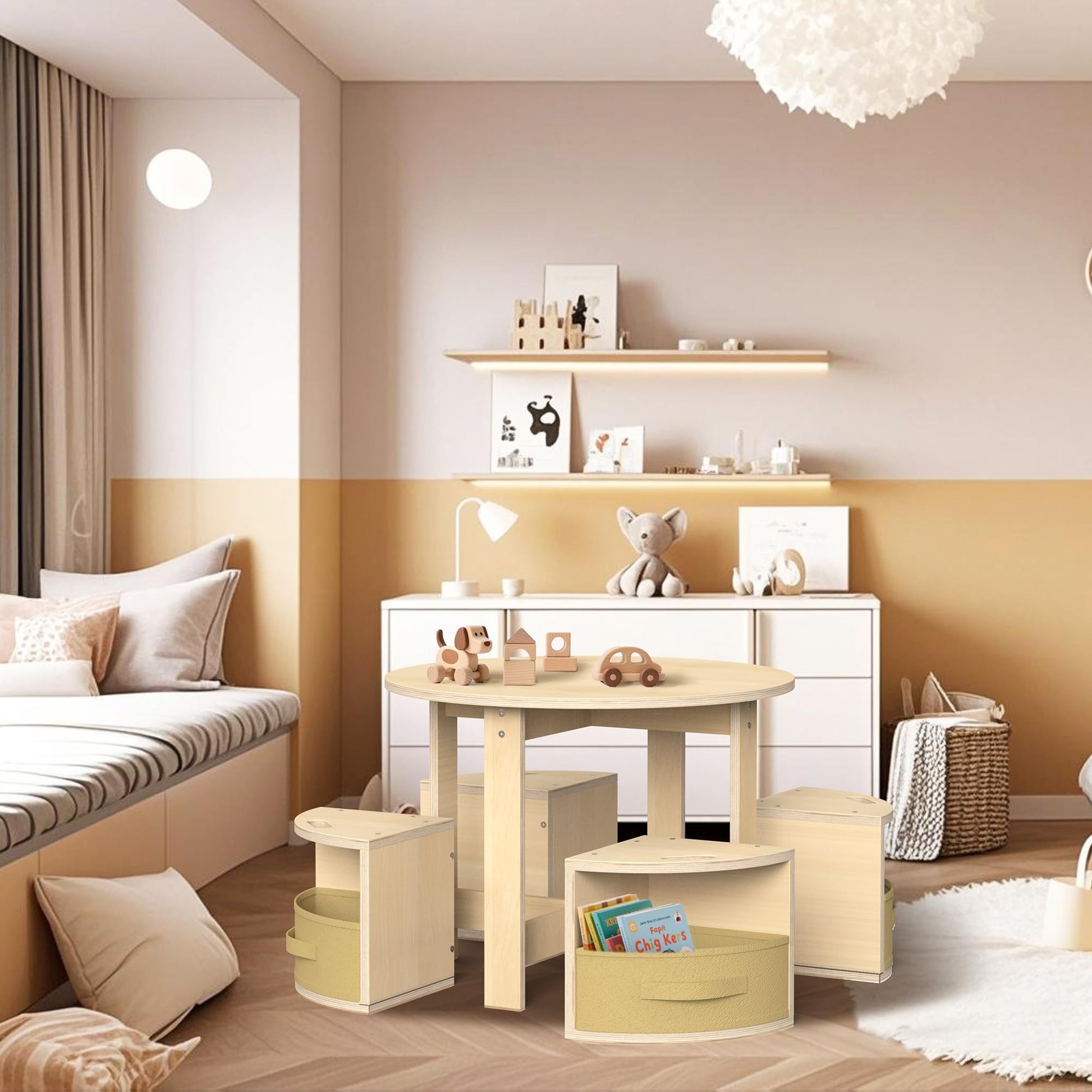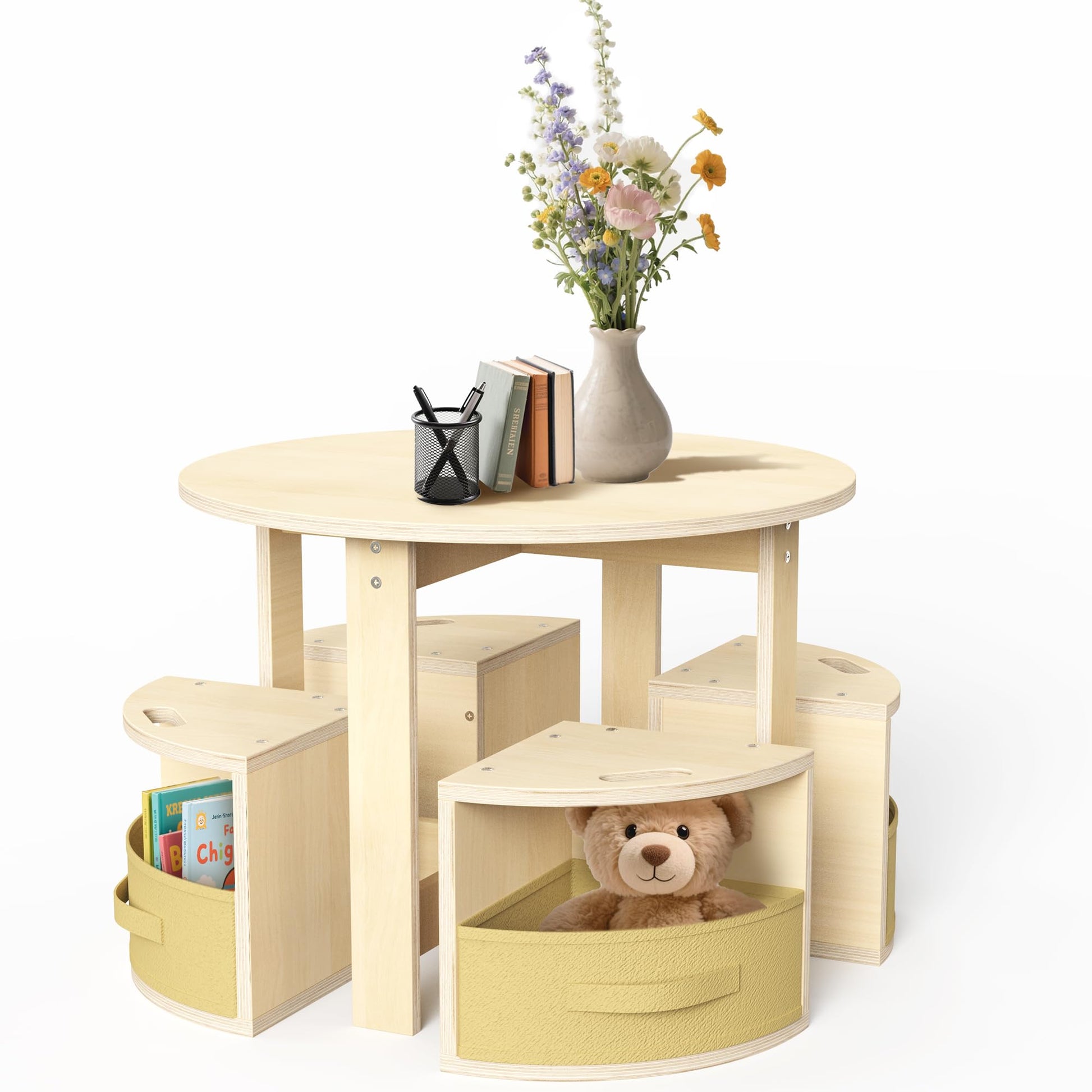 Toddler Table and Chair Set with 4 Storage Stools, Round Shaped Nesting Design