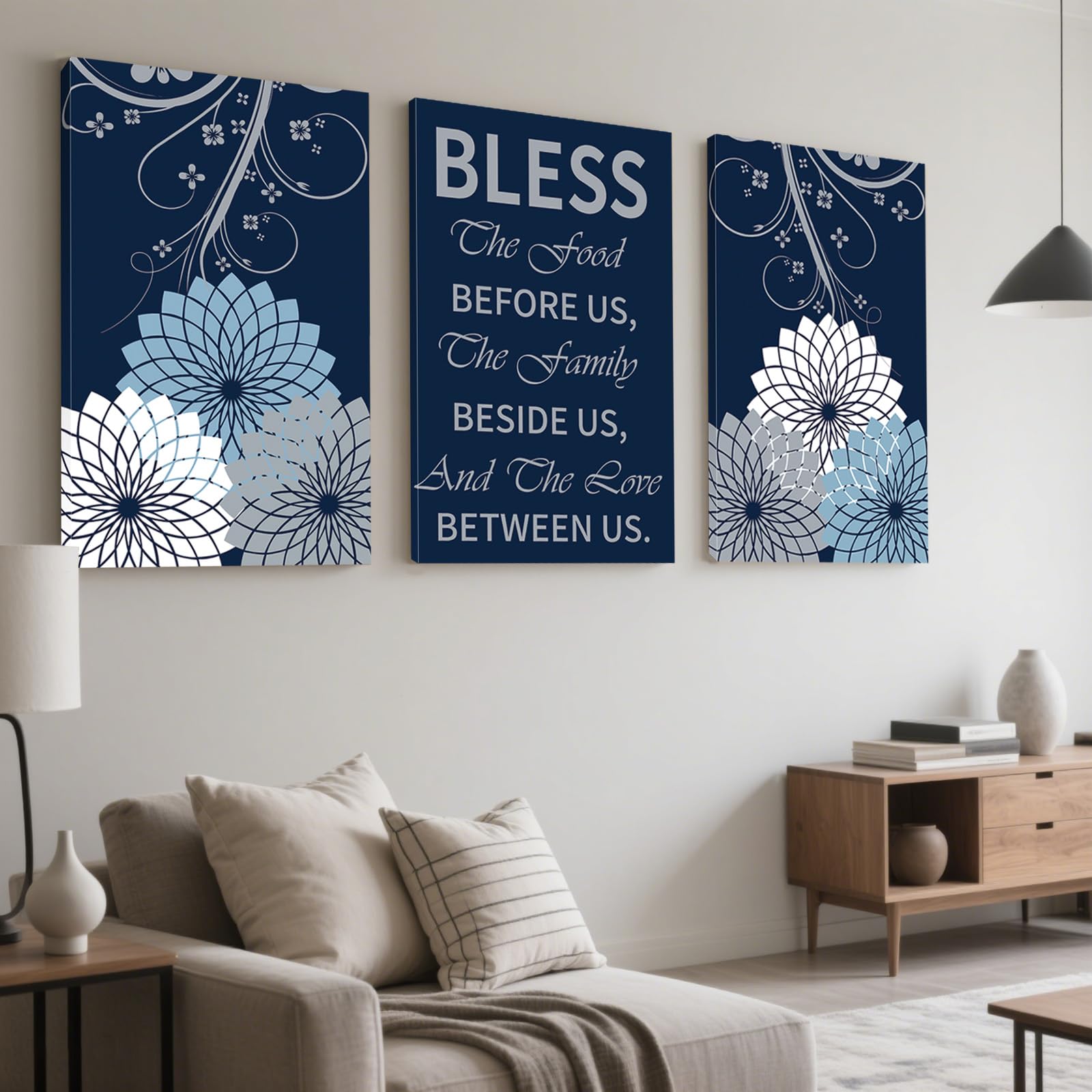 - Bless The Food Before Us Canvas Wall Art:This set of 3 unframed canvas prints features the timeless blessing "Bless The Food Before Us" alongside elegant navy blue dahlia blooms, blending spiritual inspiration with modern farmhouse aesthetics for a serene dining space