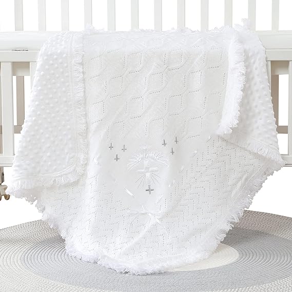 - WHITE BABY BLANKET: Baby blankets unisex is a good baptism christening gift for Newborn Boys Girls, a perfect keepsake from a godparent or relative.