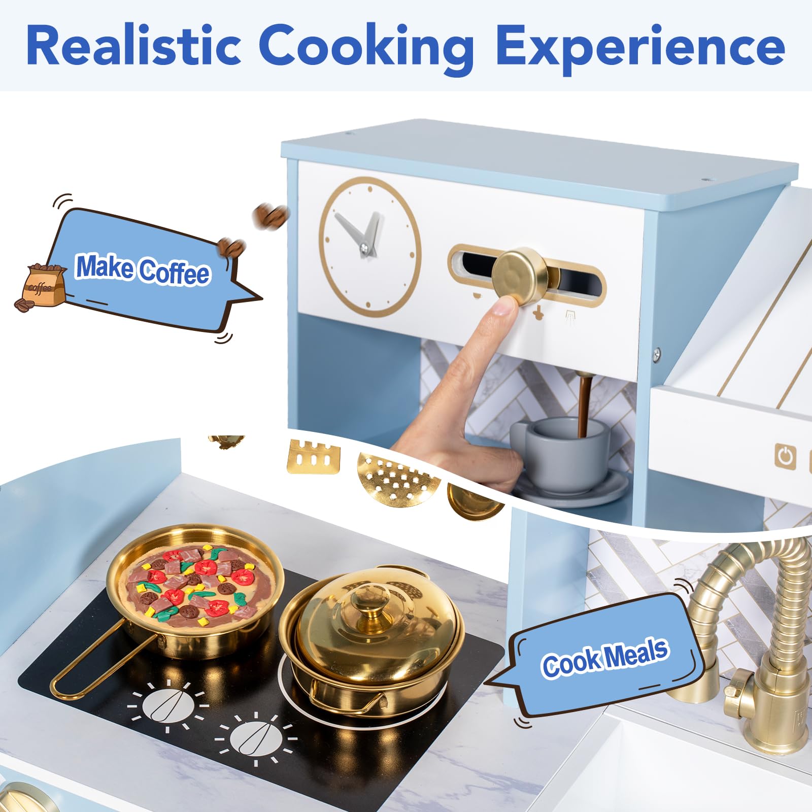 - Realistic Cooking Experience: We specially designed light for the range hood to enhance the children's cooking experience during play. And the knobs of stoves can make a click sound. The button of the coffee machine can slide and kids can choose the strength of the coffee they want. By pressing the switch of the ice maker with a cup, toddlers can feel the ice falling.