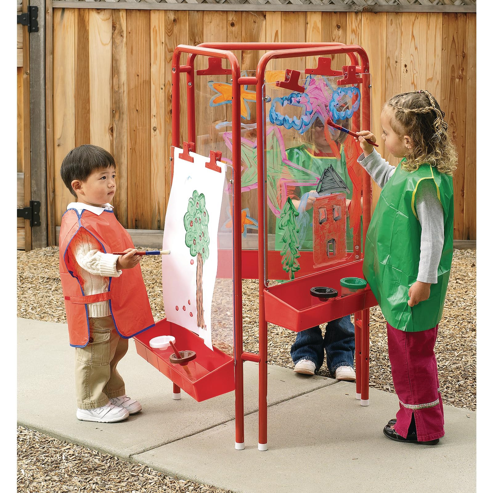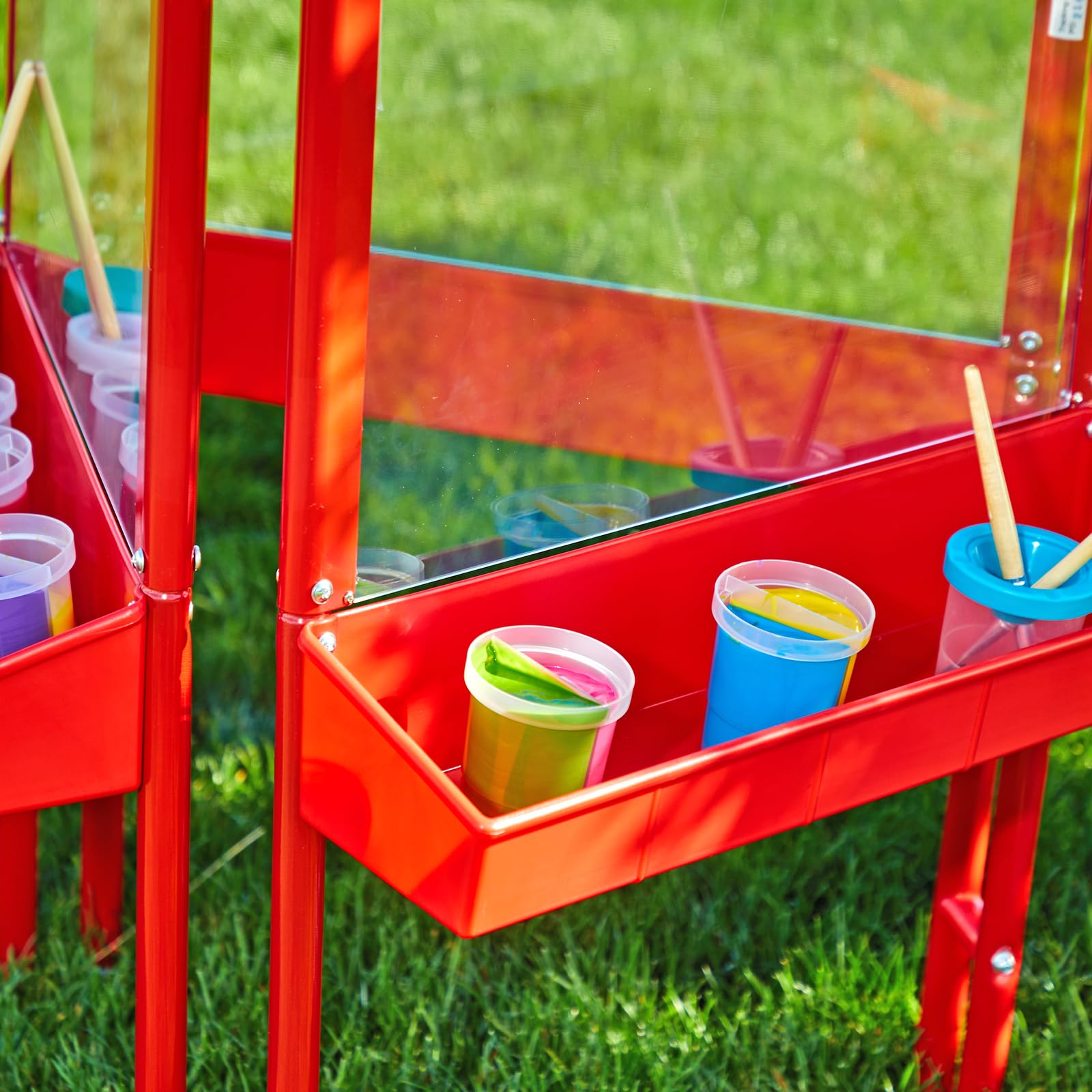 Details: Colorations 3-Way Indoor/Outdoor Acrylic Panel Easel. A great kids easels that multiple children can use. Non-rust, metal powder-coated frame is ideal for indoors or out. (EASEL: Includes sturdy plastic tray with drain holes, red plastic clips and sturdy, metal powder-coated frame.; INDOORS OR OUTDOORS: Can be used indoors or outdoors.; EASY TO USE: Clear acrylic panels allow children to paint directly onto easel surface - no paper needed!; EASY TO CLEAN: Hose down or wash with soap and water.; MEASURES: 3-way easel measures 23"L x 39"W x 47"H.) - Discount School Supply Item # 3WAPE