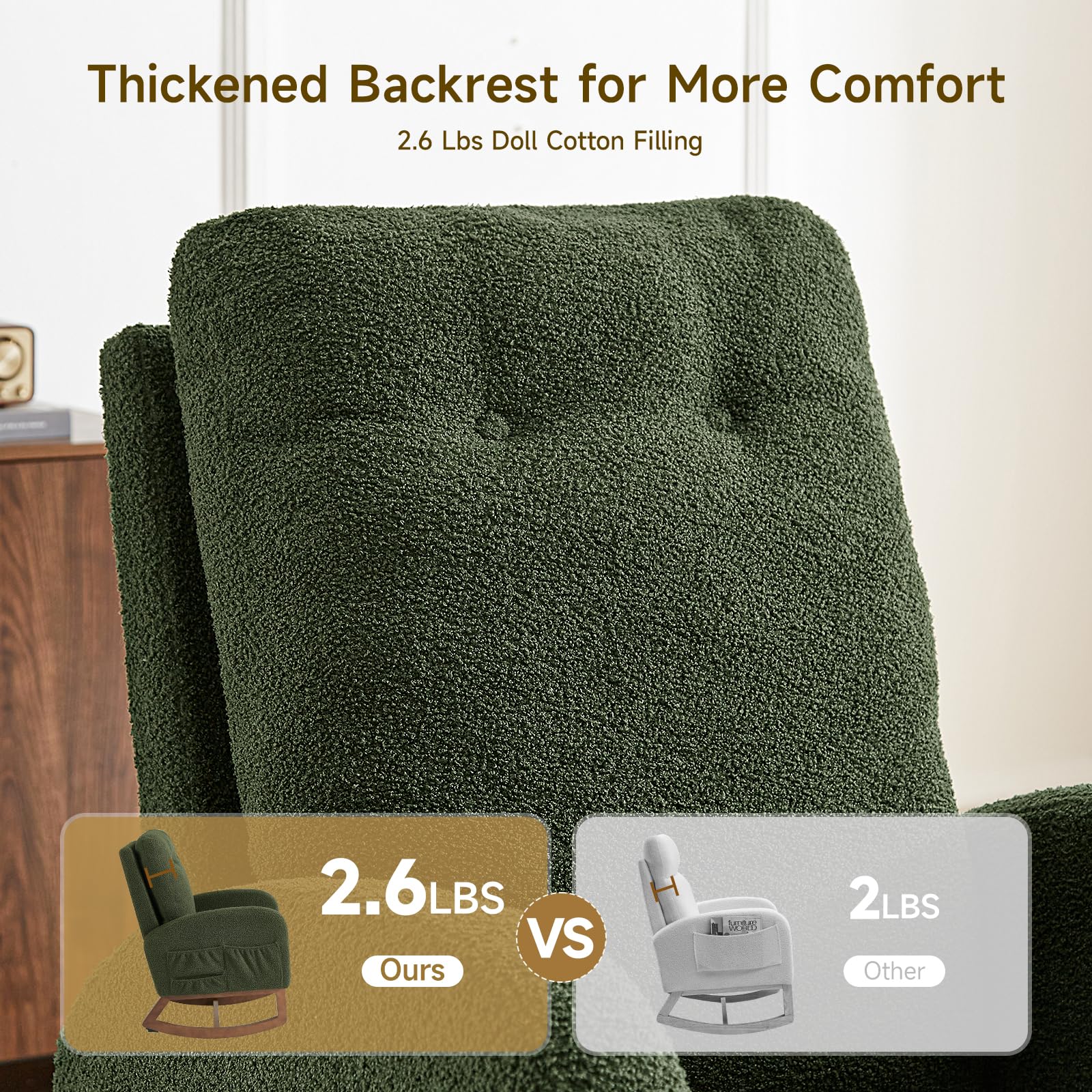 - Comfortable Sitting Experience: Filled with 2.6 pounds of cotton in the backrest, our rocking chair offers an ultra-soft and cozy sitting feel. Whether it's the elderly looking for a cozy spot to read the newspaper or relax, or parents cradling their babies to sleep with its gentle rocking motion, or even young adults unwinding by listening to music on it, this nursery rocking chairs offers comfort that suits everyone