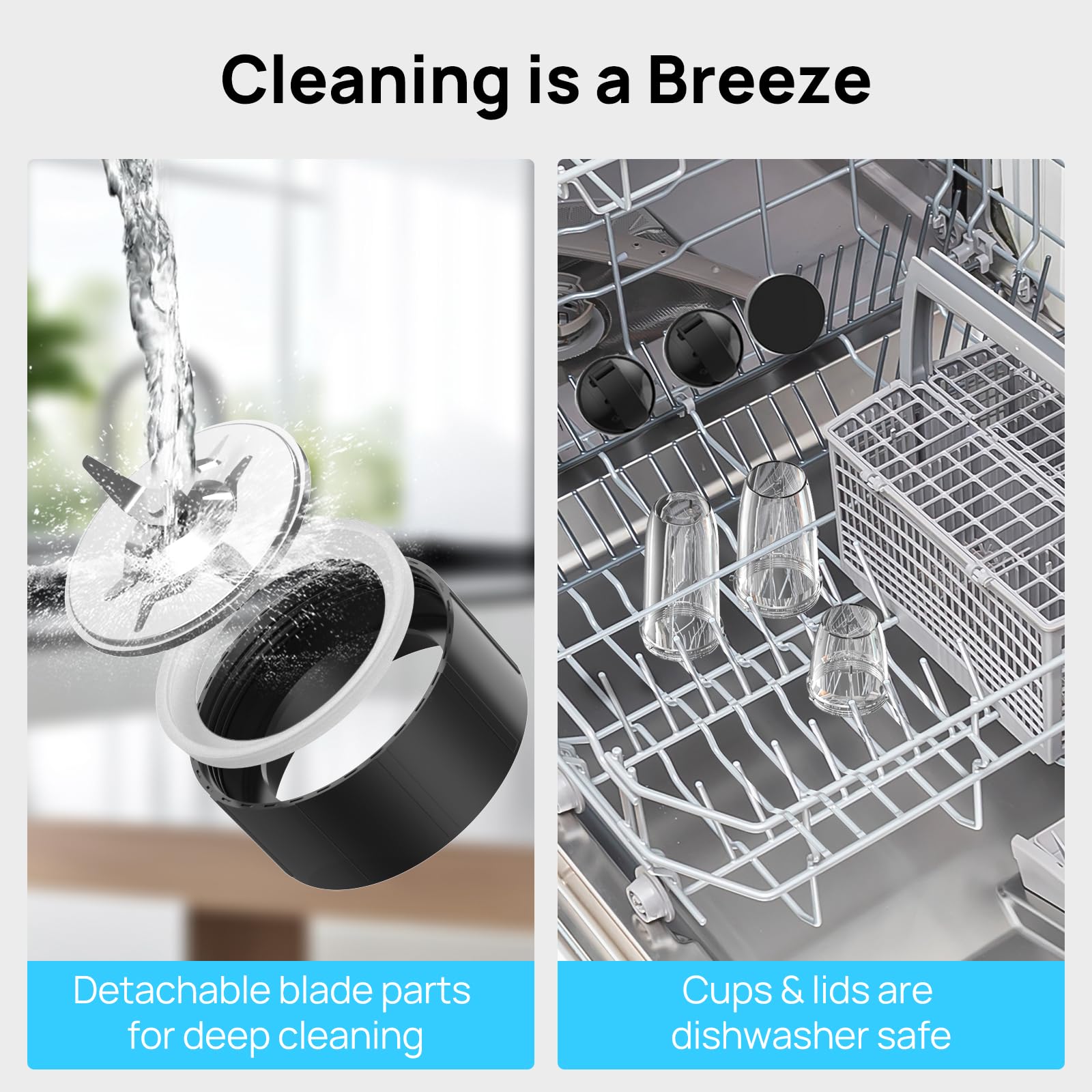 - 【Cleaning is a Breeze】 - With a drop of dish soap and some water, the blender can clean itself in seconds; Detachable blade parts for deep cleaning; Cups, lids, and blade assembly are dishwasher safe