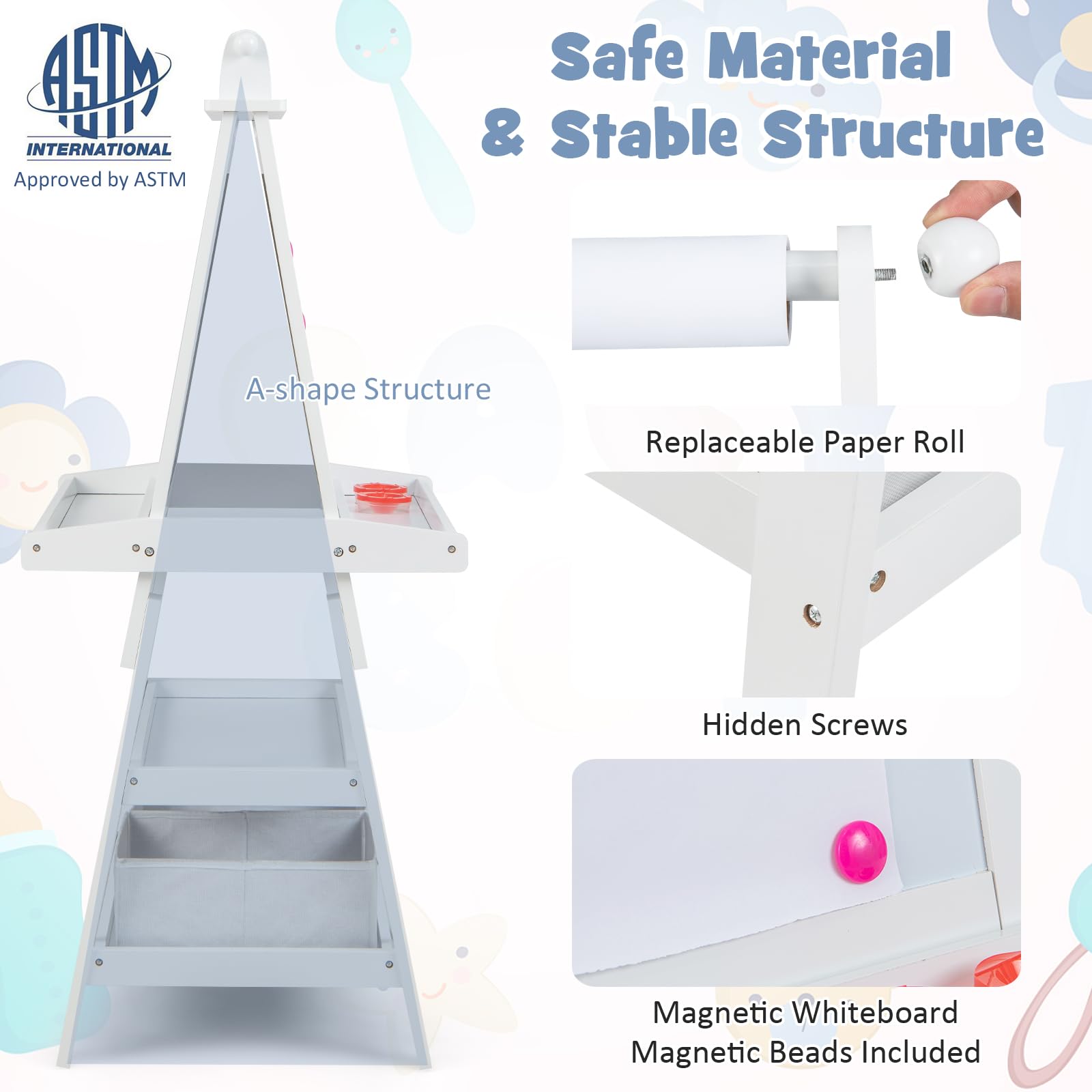 Costzon Kids Art Easel, 3 in 1 Double-Sided Painting Easel w/Magnetic Whiteboard, Chalkboard & Paper Roll, 2-Tier Storage Rack & 2 Boxes, Standing Easel for Kids, Toddlers, Gift for Boys, Girls