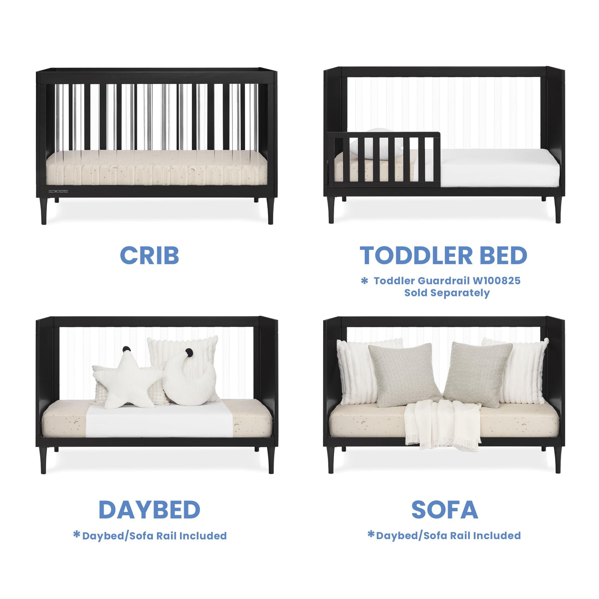 Details: For a modern nursery, go with the Bowie 4-in-1 Convertible Crib by Delta Children! Its recyclable and non-toxic clear acrylic slats, paneled ends and sleek feet will add instant style to any space. The Bowie 4-in-1 Convertible Crib is a crafted-to-last piece that goes from baby years and beyond. It features three mattress heights, and converts into a toddler bed, daybed and sofa (Daybed/Sofa Rail included; Toddler Guardrail #W100825 sold separately). Plus, this crib is GREENGUARD Gold Certified, which means it’s built to contribute to cleaner air for a healthy home. Available in Bianca White and Black. Crib mattress sold separately. To complete the look, pair this crib with the coordinating Bowie 3 Drawer Dresser with Changing Top.