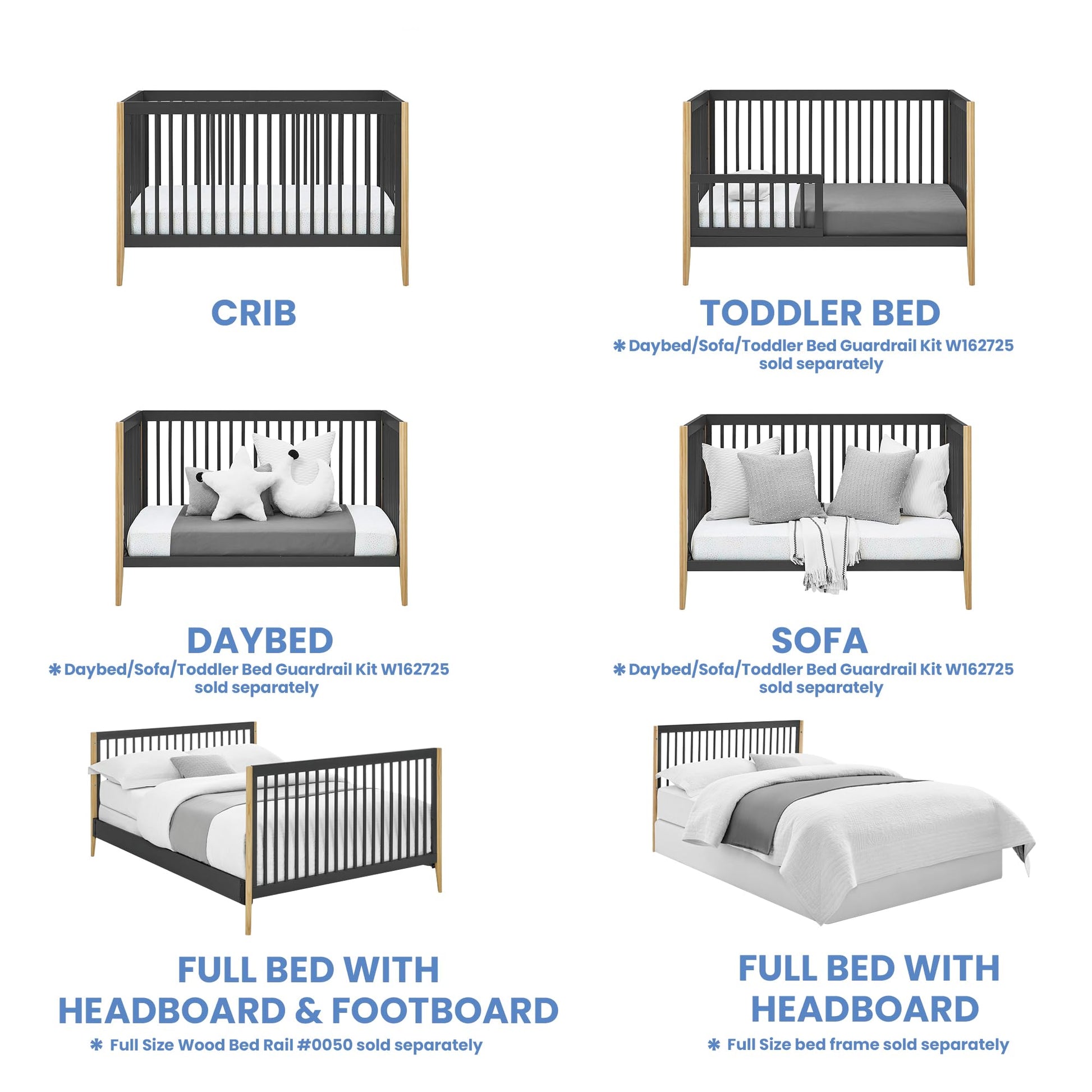 - 6-IN-1 CONVERTIBLE CRIB: Crib converts to toddler bed, daybed, sofa, full-size bed with headboard and footboard, and full-size bed with headboard only ( Daybed/Toddler/Sofa Rail #W162725, Full-Size Bed Rails #0050 sold separately). Available in multiple colors