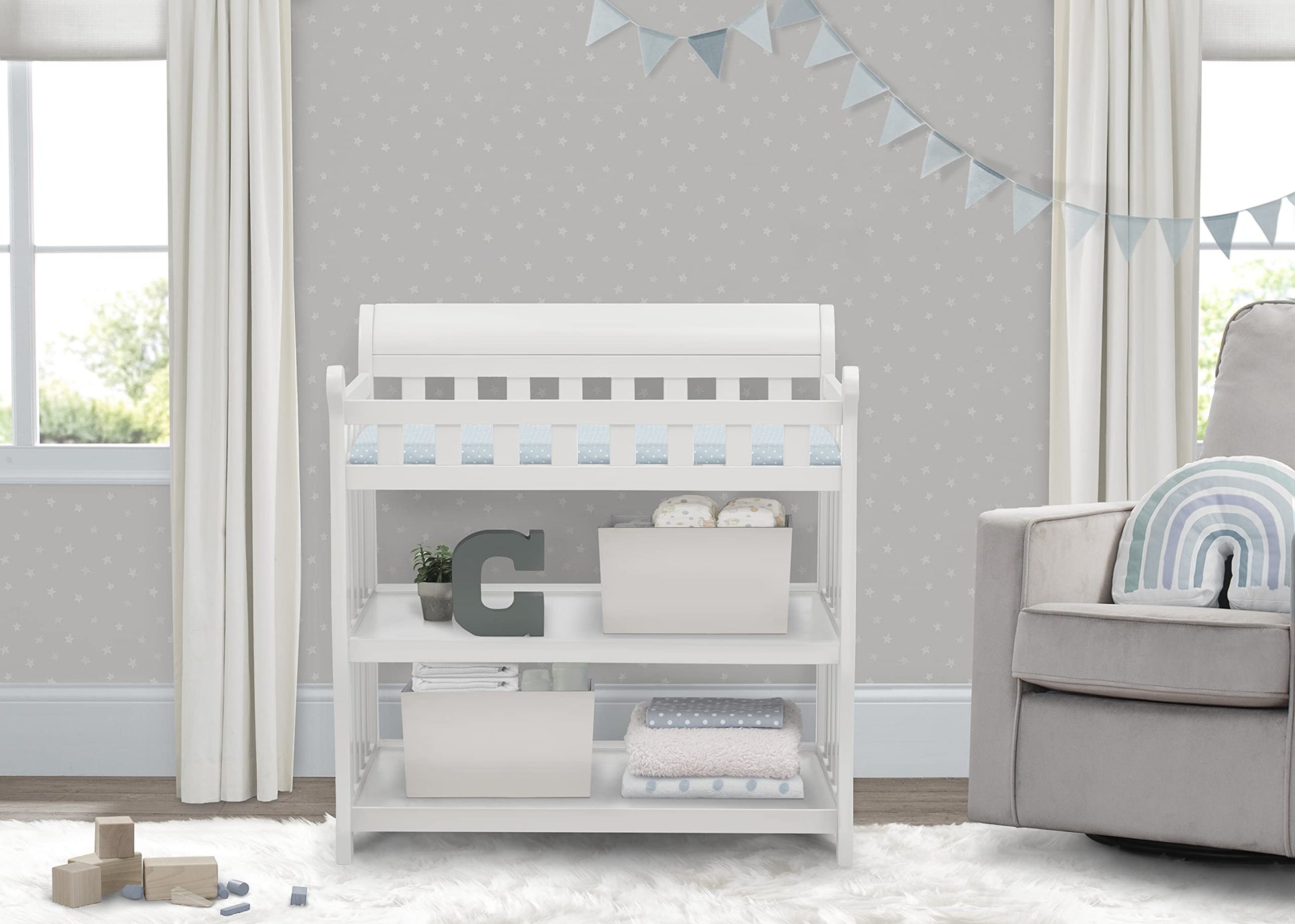 - Contains 2 shelves, safety belt, top safety rails, changing pad