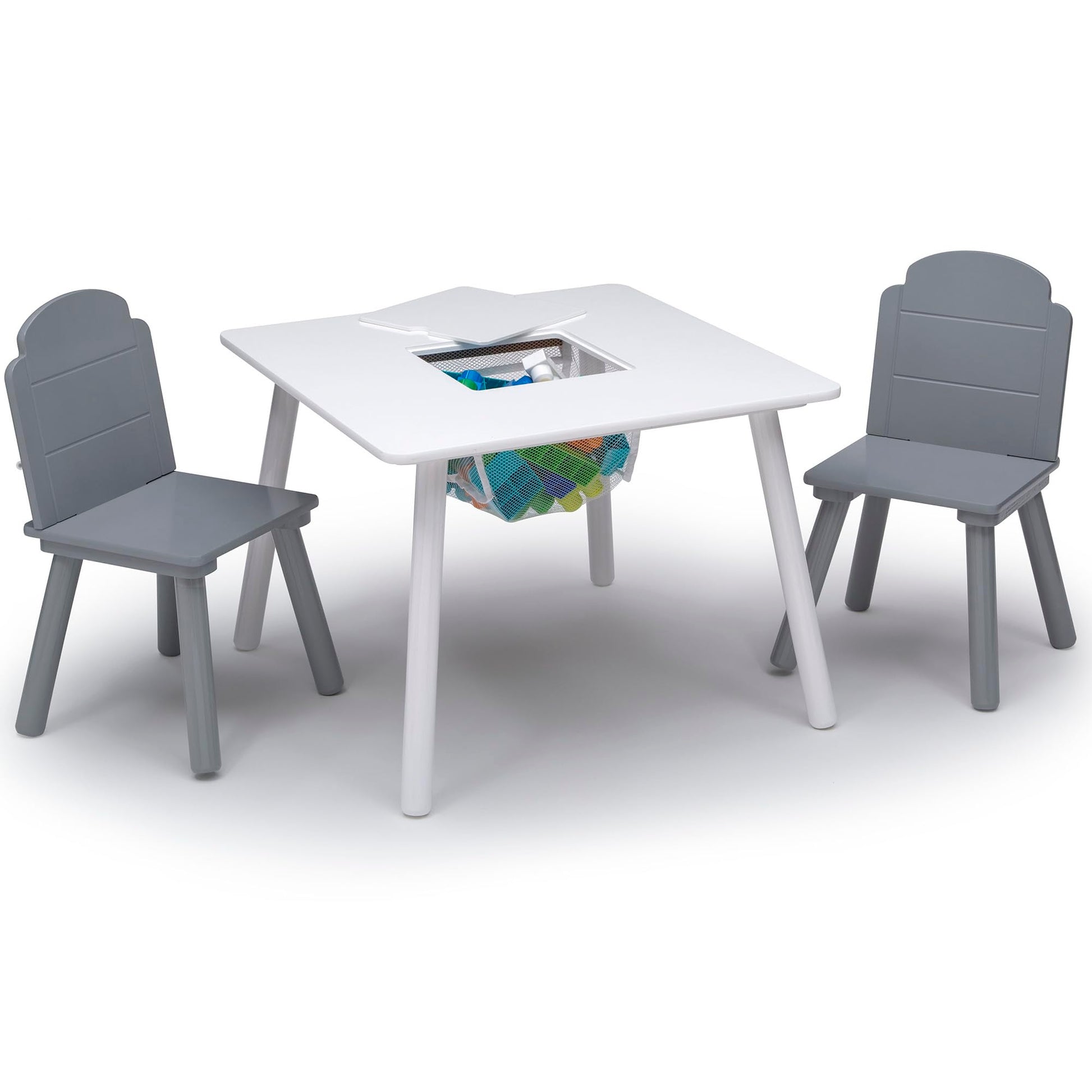 - Set includes one table and two chairs | Table features handy toy keep in the center for easy storage