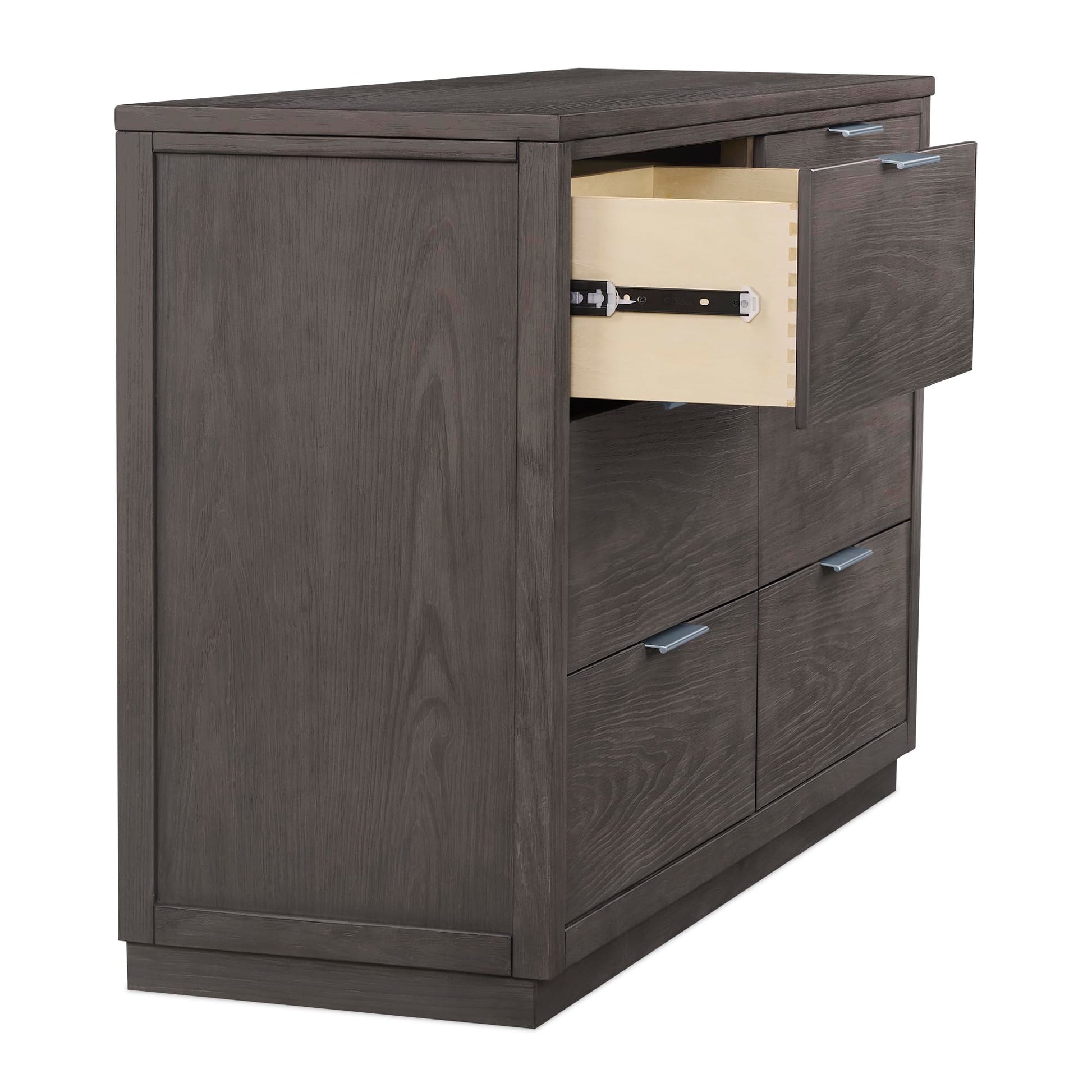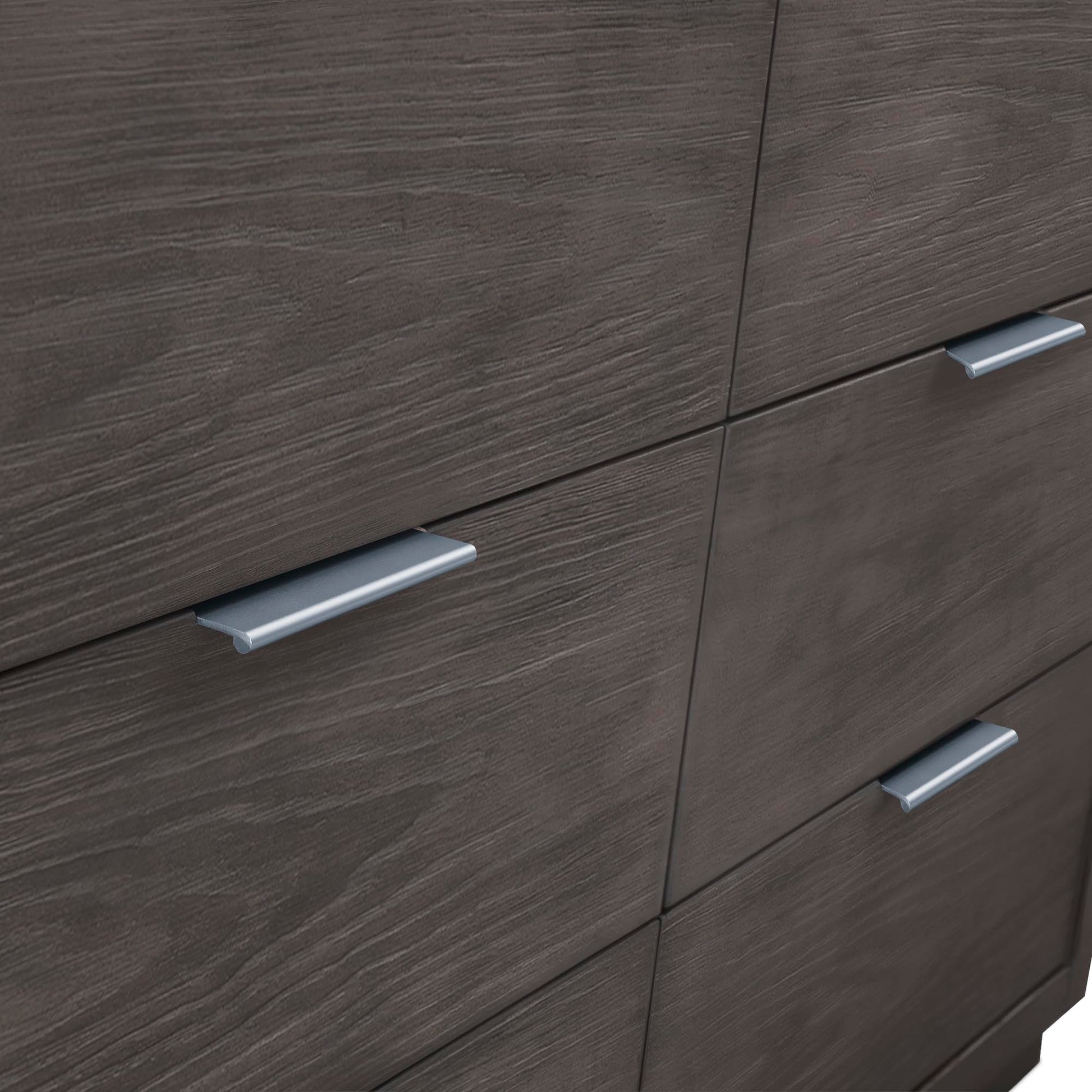 - SLEEK HARDWARE: Black chrome drawer pulls on Rustic Grey and Teak Brown Dressers | Melted bronze drawer pulls on Aged Oak and Chestnut Dressers