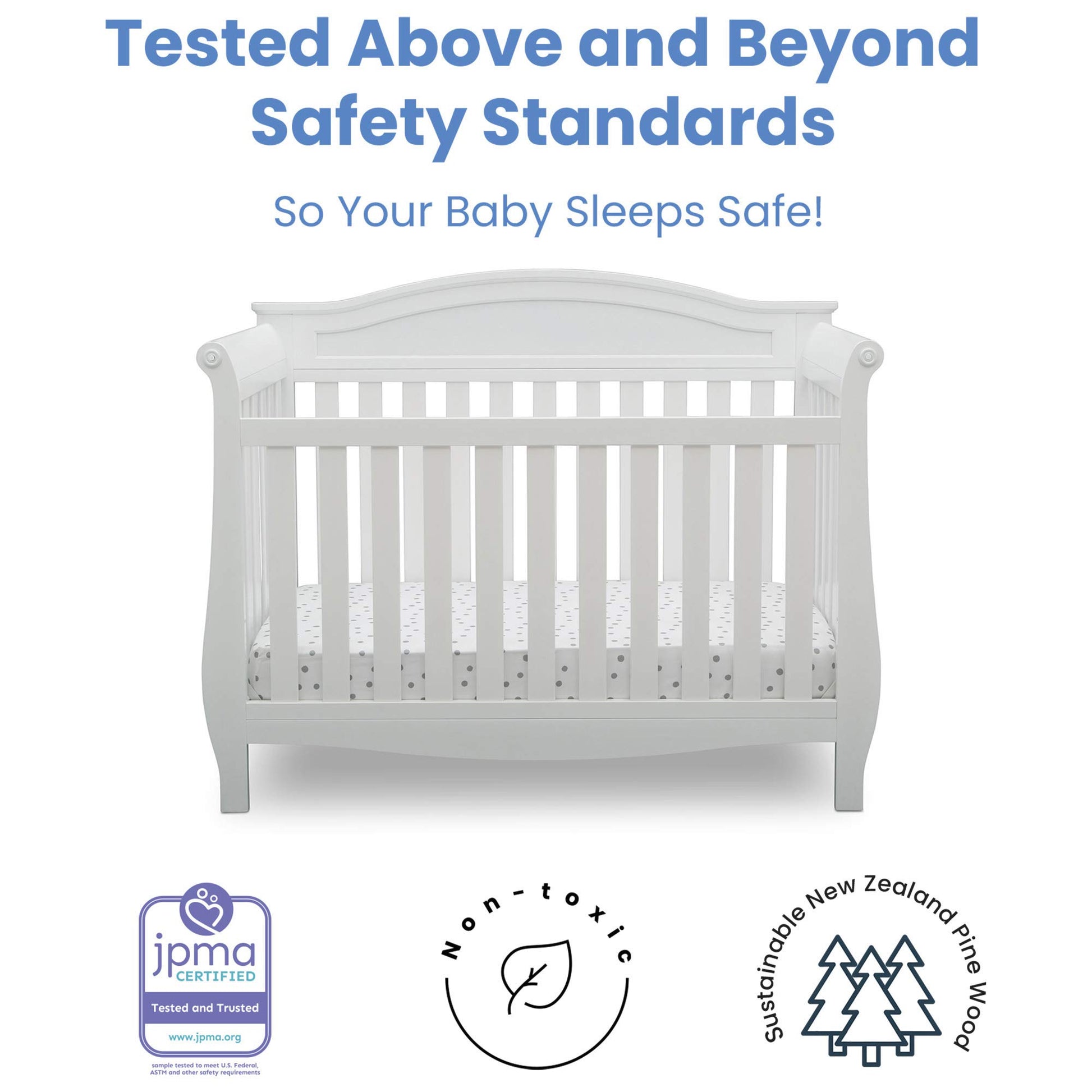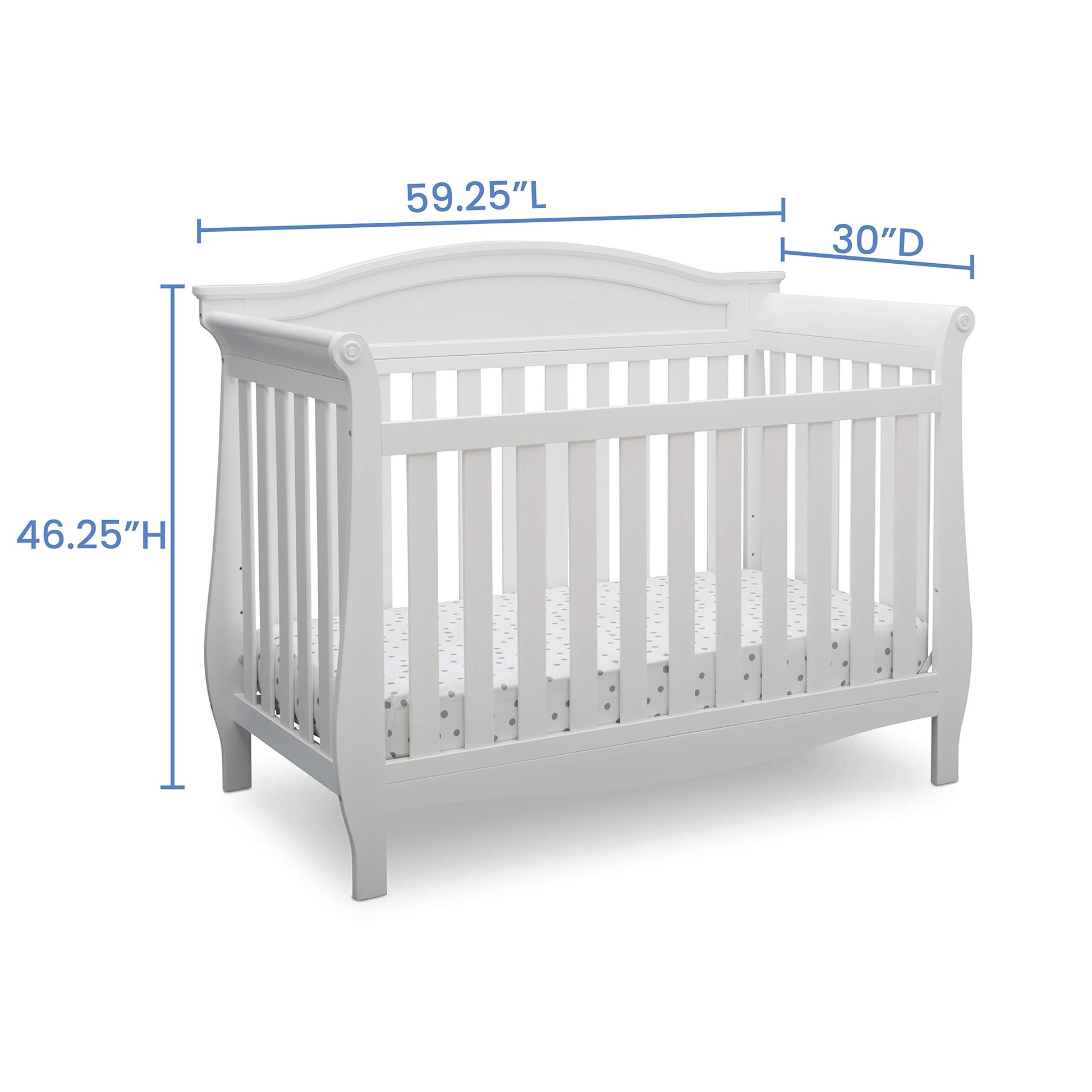 Details: Welcome Baby home with the Lancaster 4-in-1 Convertible Baby Crib from Delta Children-rolled arms with a decorative rosette accent and sleigh-style silhouette make this classic crib a timeless choice. Designed to grow with your little one, this baby crib features three mattress heights that allow you to lower the crib mattress as your child begins standing. Then, once your child is ready to make the move to a big-kid bed, this crib converts into a toddler bed, daybed and full size bed to accommodate each stage of their life (Daybed Rail included; Toddler Guardrail and Full Size Bed Rails sold separately). A great value, the Lancaster 4-in-1 Convertible Crib from Delta Children is the only bed your child will ever need. Available in Grey, Bianca White and Dark Chocolate. Coordinates with other items in the Lancaster Collection from Delta Children. Delta Children was founded around the idea of making safe, high-quality cribs affordable for all families. That's why all Delta Children cribs are JPMA certified, and are tested above and beyond industry standards.