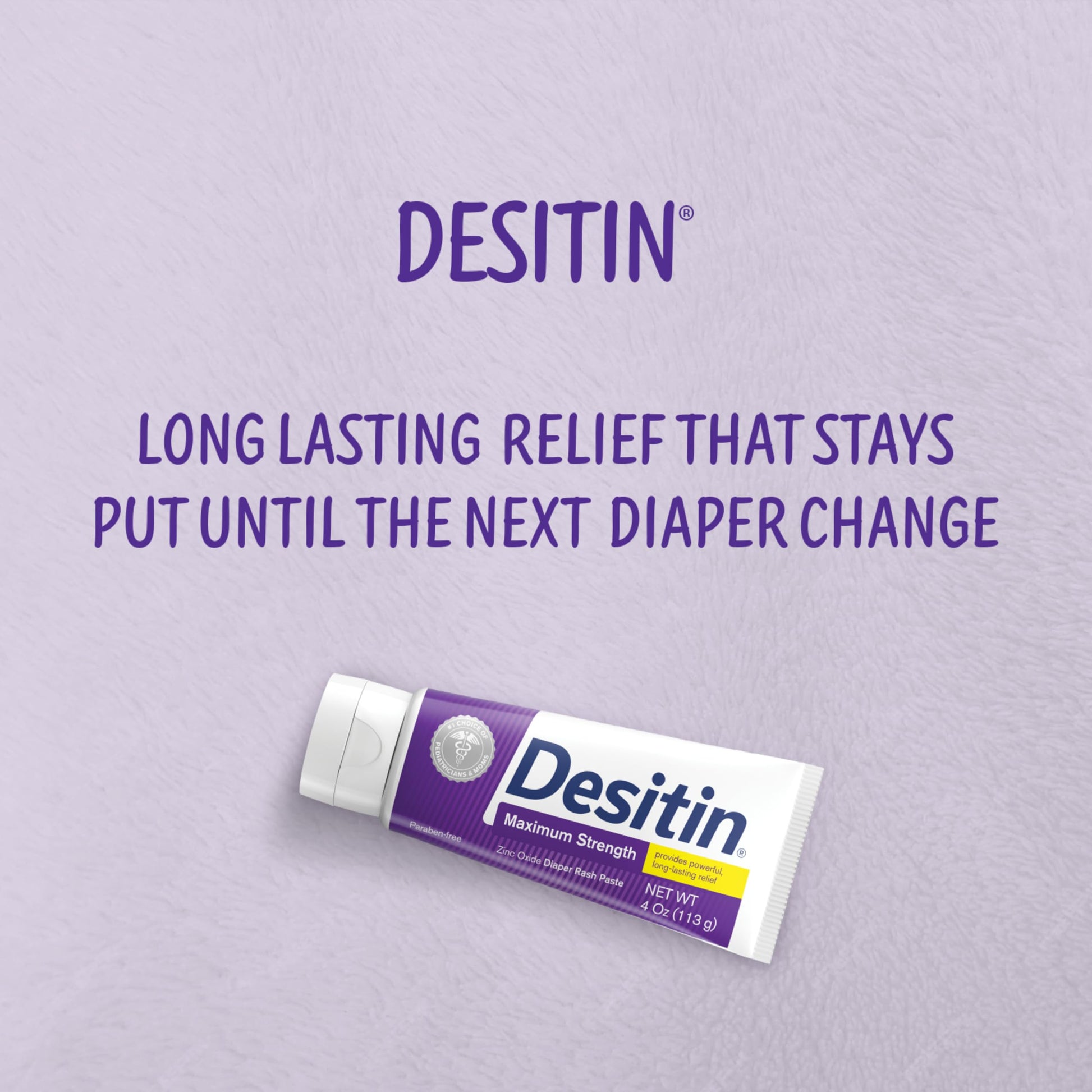 - 4.8-ounce tube of Desitin Maximum Strength Diaper Rash Paste with 40% zinc oxide works on contact to treat and help prevent baby diaper rash discomfort