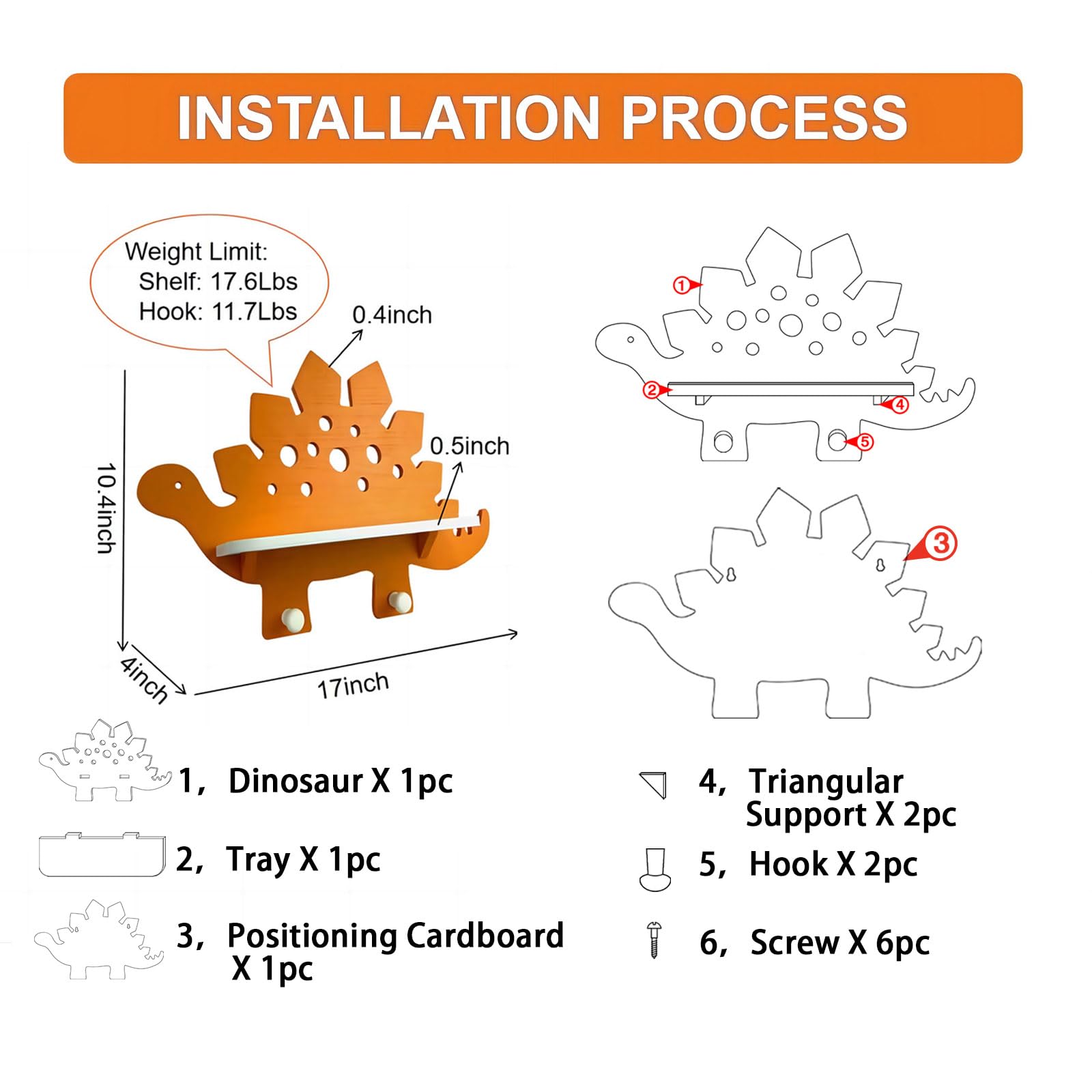 Details: Brighten up your child's room with this delightful dinosaur-shaped wall shelf. Perfect for a touch of cute prehistoric fun, this shelf is ideal for holding small toys, books, and other treasures. Theme: Dinosaurs Wall Shelf Color: Vibrant Orange with White Accents Material: High-quality wood, finished with child-safe, non-toxic paint Dimensions: 10.4*17*4.5inch Features: Sturdy and smooth shelf surface for safe use,Playful cut-outs in the dinosaur's body add a fun detail Includes two white knobs at the base for hanging small items Installation: Easy to mount on any wall, no assembly required Use: Ideal for decoration and light storage in nurseries or children's bedrooms This dinosaur shelf not only serves as functional storage but also doubles as charming wall decor, making it a must-have for young dinosaur enthusiasts and a cheerful addition to any young child's space.