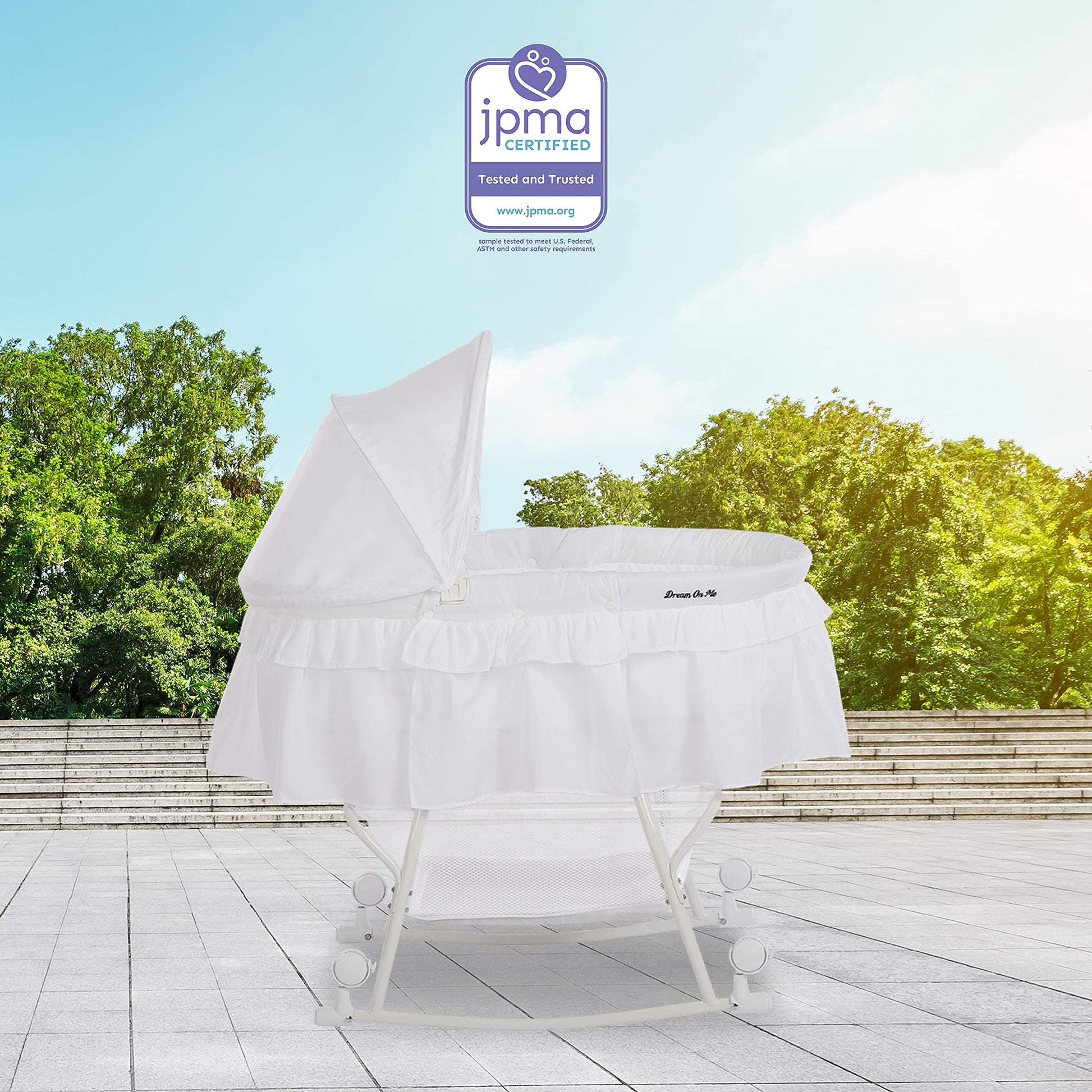 - SAFETY MATTERS: The Lacy Bassinet is JPMA certified to meet/exceed ASTM standards. Product specs are: 34Lx18Wx41.5H inches; it weighs 11 lbs. It includes the regulatory 1” thick inch mattress pad; dimensions are: 30Lx15Wx1H inches