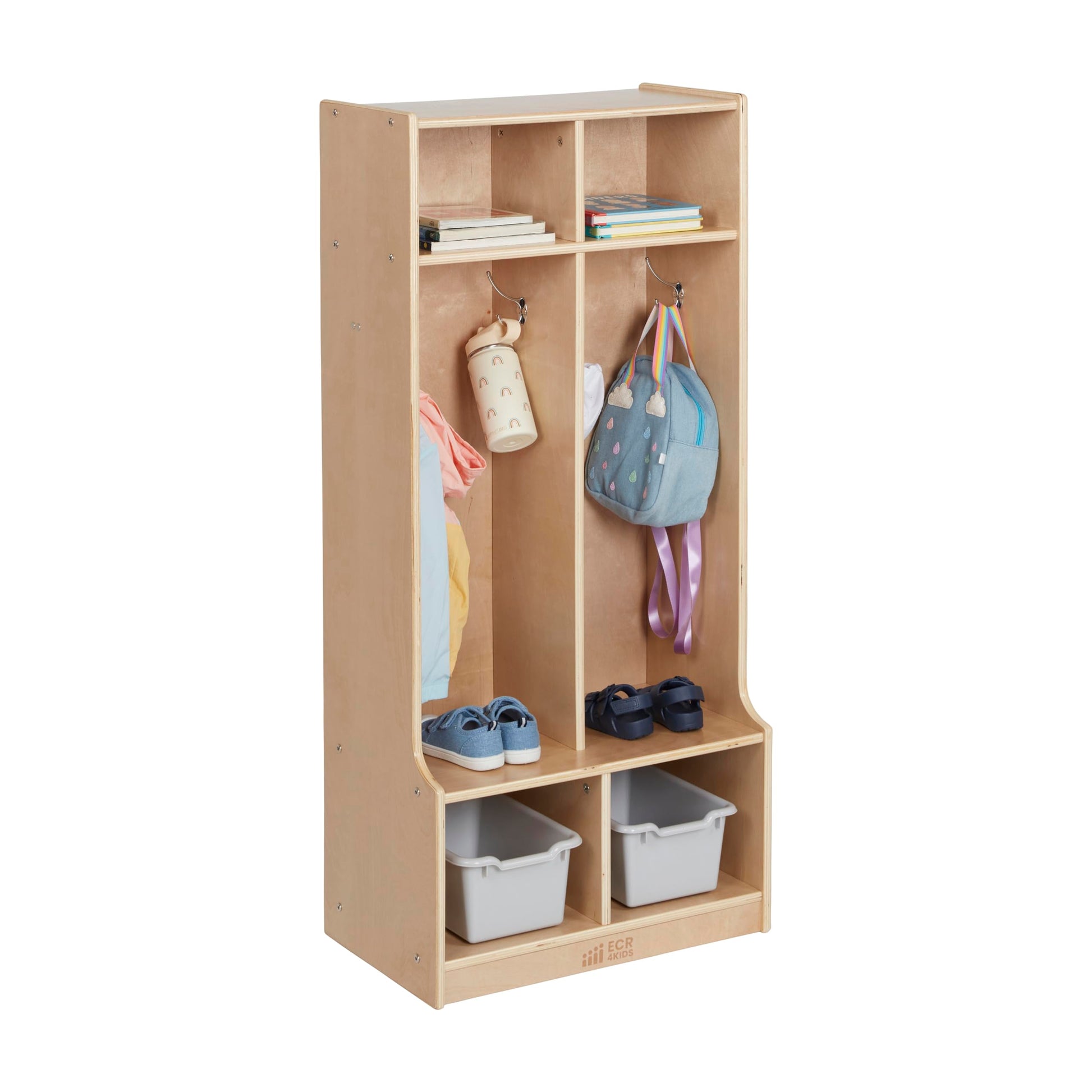Details: Maximize space and keep your room organized and clutter-free with the ECR4Kids 2-Section Coat Locker with Bench. The wooden locker features two long compartments with four double coat hangers for sweaters, toddler backpacks, and umbrellas. Give children their own separate cubby storage to keep art projects, homework, and personal belongings organized. Little ones can use the bench to take off their shoes or put them back on and tie their laces. Pair with ECR4Kids Scoop Front Storage Bins to keep little things contained and off the floor; bins are sold separately. Use in a children’s bedroom to organize dress-up clothes, costumes, accessories, hats, gloves, and more. The low-profile open-face shelves encourage children to care for their belongings and clean up independently. The drop-and-go storage is constructed from sustainably harvested birch plywood with a durable finish sealing the wood surface and resisting scratching. A UV inhibitor helps furniture resist ultraviolet light and yellowing. Natural birch plywood is extremely durable and will hold up to everyday use in a daycare, or preschool, and is great for the home. Combine the Montessori storage with other ECR4Kids Birch Collection furniture pieces to complete the space.