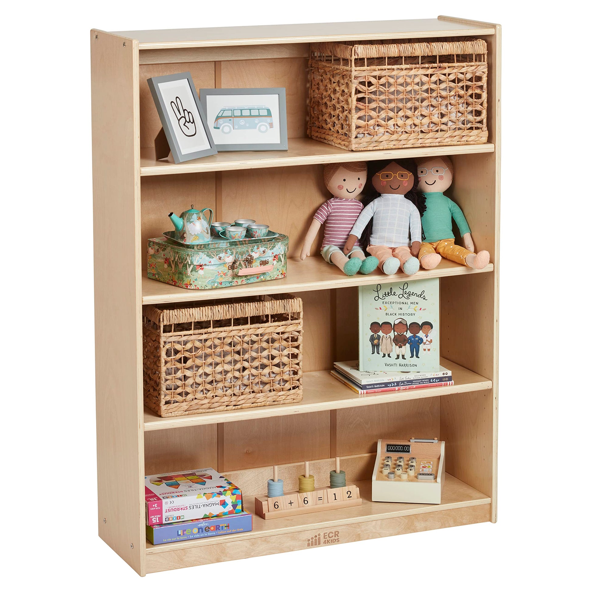 - Wooden Bookshelf: Four shelves provide ample space to store and organize books, board games, blocks, and arts and crafts supplies; three shelves adjust in 1.25” increments to maximize storage space