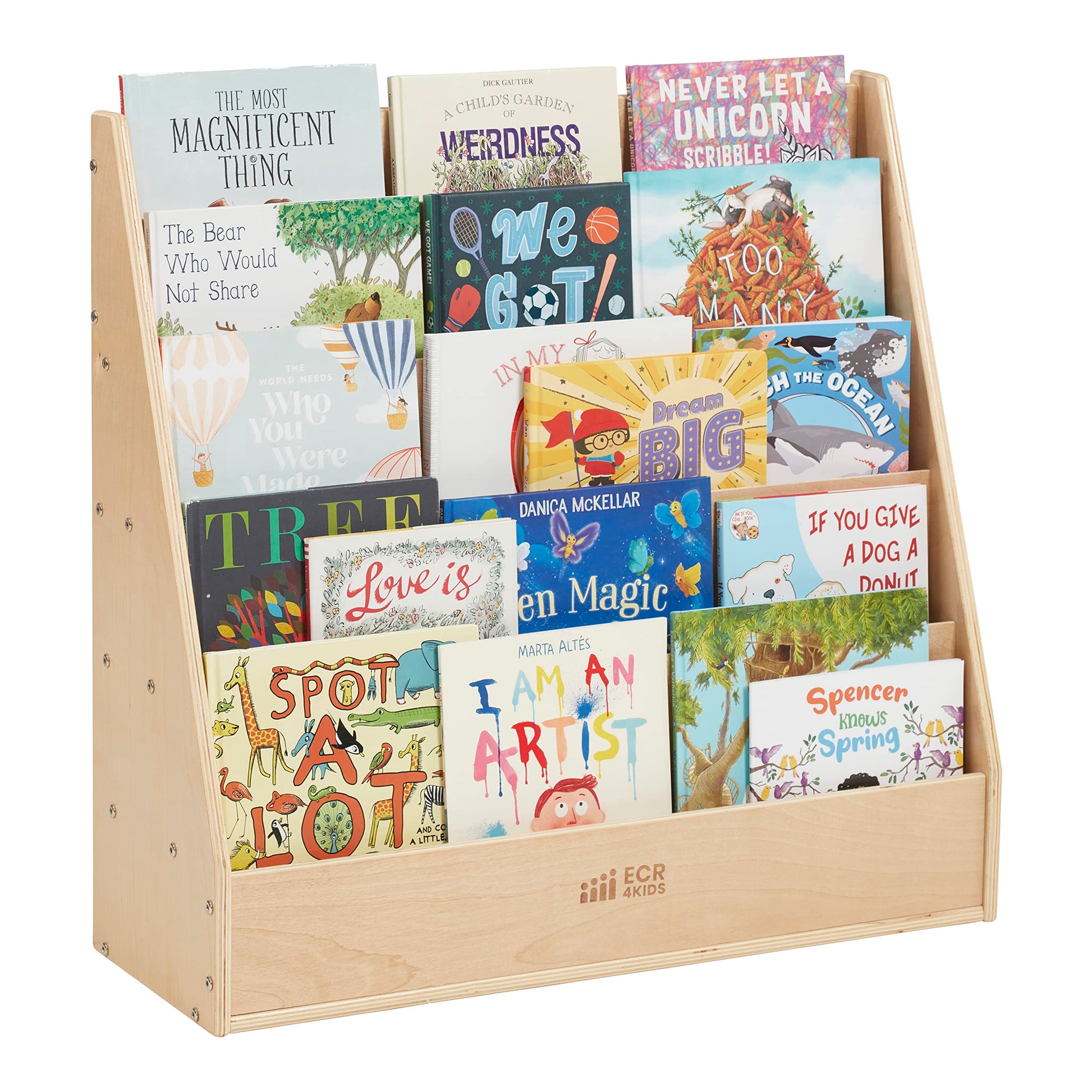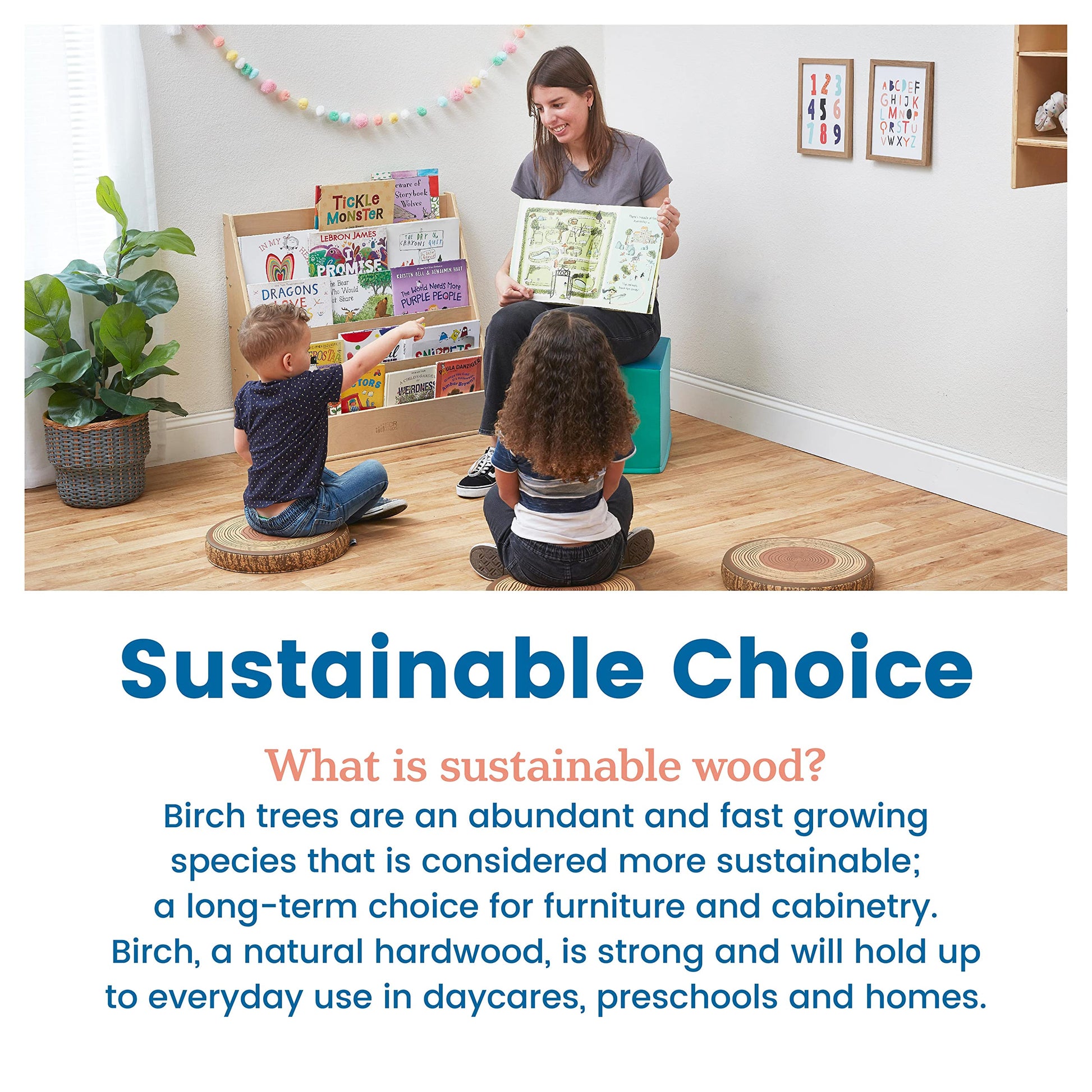 Details: Create a library and a love of reading with ECR4Kids Birch Streamline Book Display. Children’s book stands are a great way to introduce literacy at a young age in daycares, preschools, and at home. Designed to grow with little ones, this bookshelf helps parents and educators provide exposure to literature while staying organized. Instilling consistent reading routines in children helps develop their interests and cultivate a passion for learning. The five forward-facing shelves are deep to provide ample storage to display and store all your child’s books, magazines, and other literature. The tiered display keeps stories forward-facing with covers visible allowing children to select their favorite book confidently and clean up when story time is over. The streamlined design can be used against a wall or as a play space partition utilizing the four shallow shelves on the back for small toys. Constructed from sustainably harvested birch plywood with a durable finish sealing the wood surface and resisting scratching. A UV inhibitor helps furniture resist ultraviolet light and yellowing. Natural birch plywood is extremely durable and will hold up to everyday use in early childhood environments. Pair with ECR4Kids Birch Furniture to complete the set, sold separately.