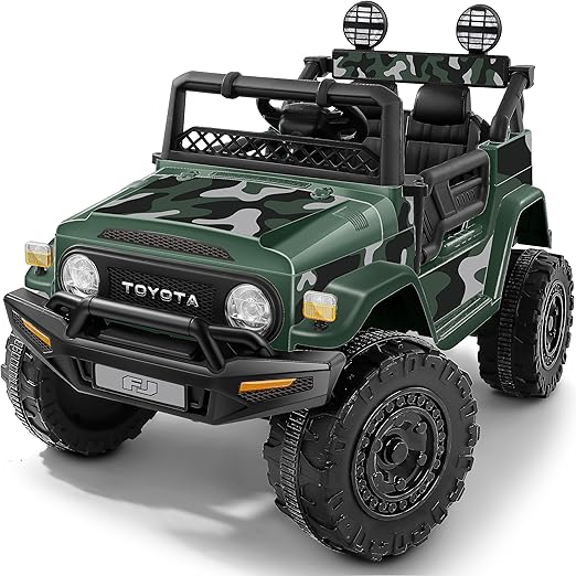 - Equipped with a robust 12V motor and all-terrain traction tires for conquering grass, gravel, and slopes. Features off-road styling with a mesh windshield, lockable doors, adjustable seatbelts, and bright LED headlights for immersive play.