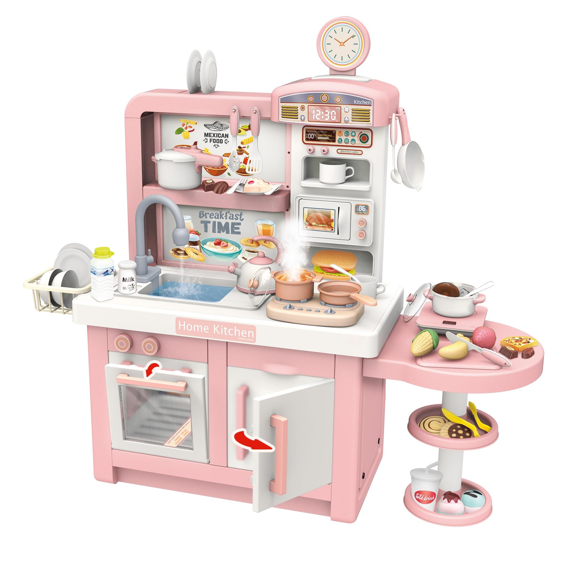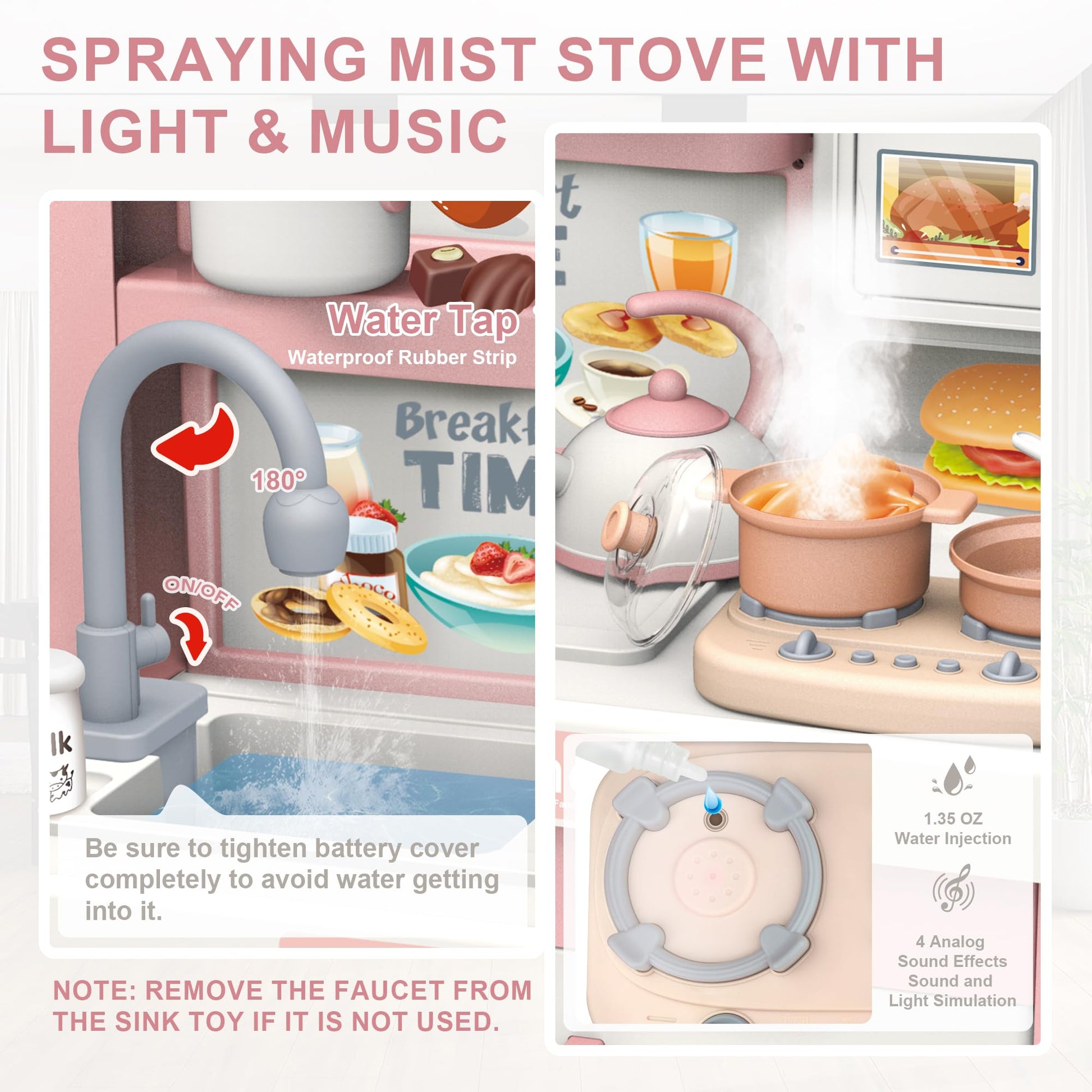Details: Elevon Pretend Play Kitchen Toy Set for Kids, Interactive Playset with Lights and Sounds, For Toddlers 3+ Years Old, 49 Piece Toy Accessory Set with Cooking Stove, Sink, Play Food, Realistic - Pink
