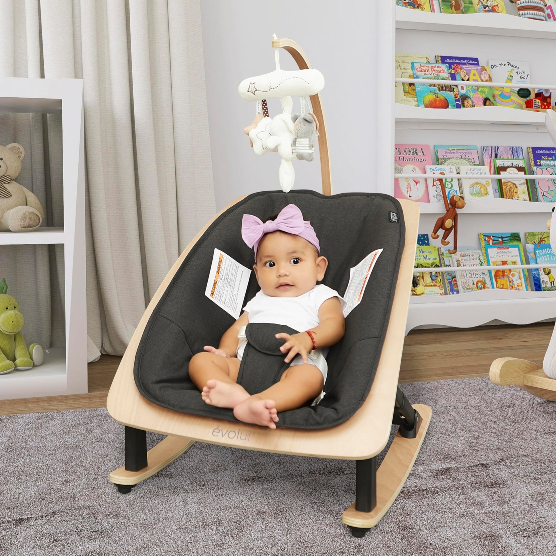 - CONVENIENTLY DESIGNED: This rocker allows you to fold it easily with just one hand, comes with storage in folded mode, and with a removable, soft toy mobile.