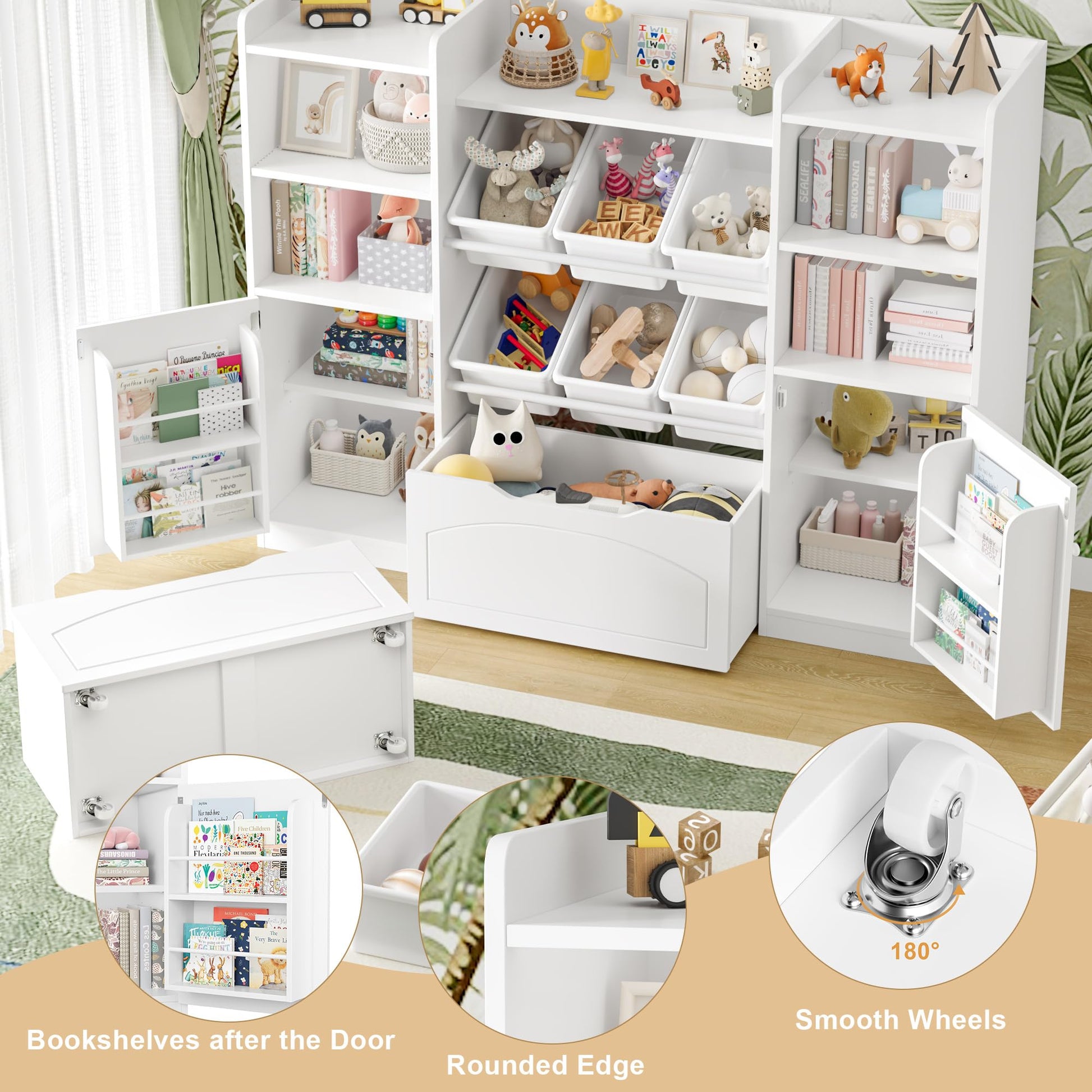 - 5-in-1 Multifunctional Toy Organizer: The toy storage organizer integrates 6 toy bins, storage cubbies, two doors with 2-tier bookshelf, a large movable drawer, and open display shelves to form an organized play area for your little one. So that They will not rummage through the messy room for toys.