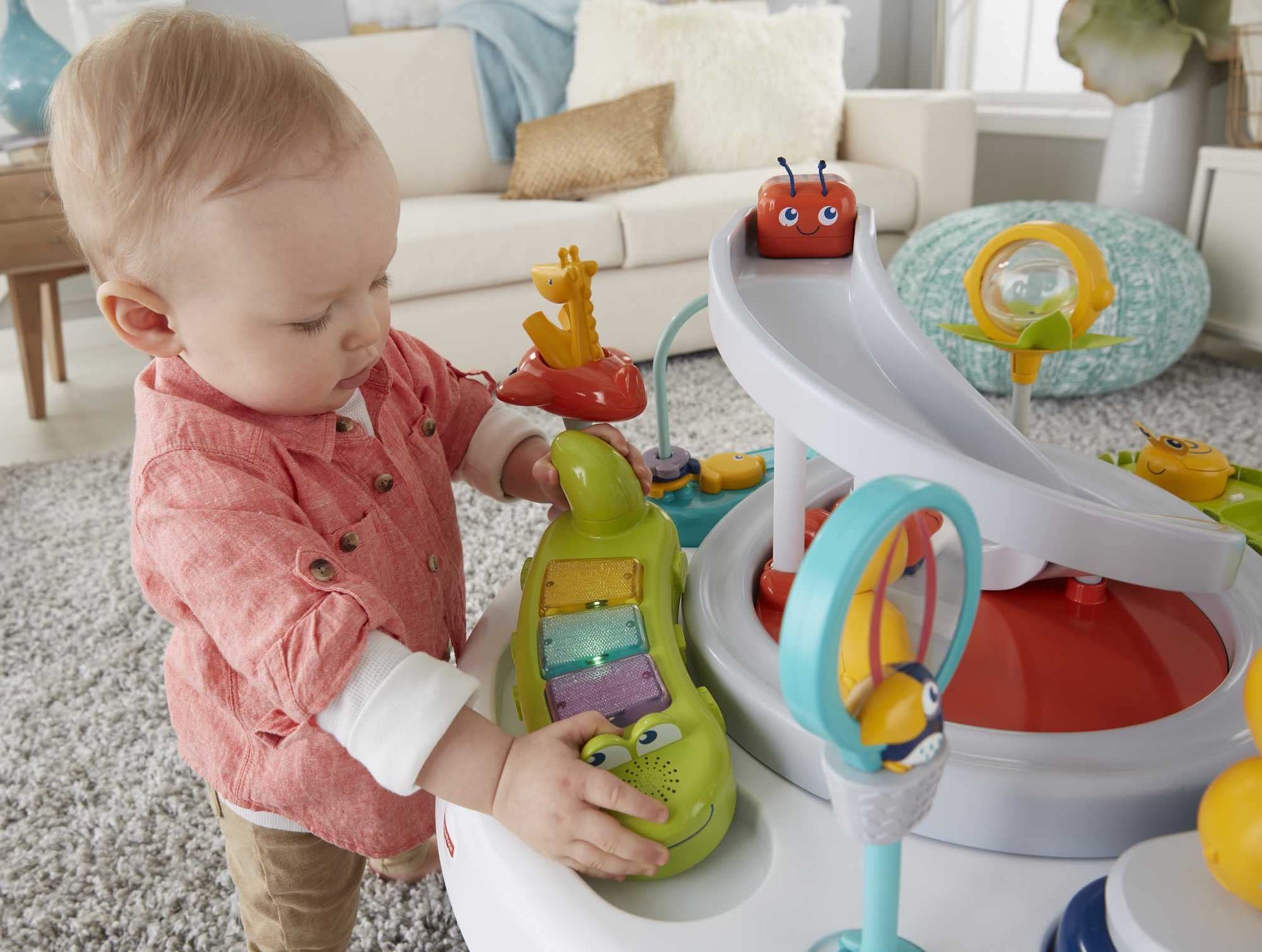 - Seat spins for 360 degrees of play with repositionable activity toys & add-on spiral ramp!
