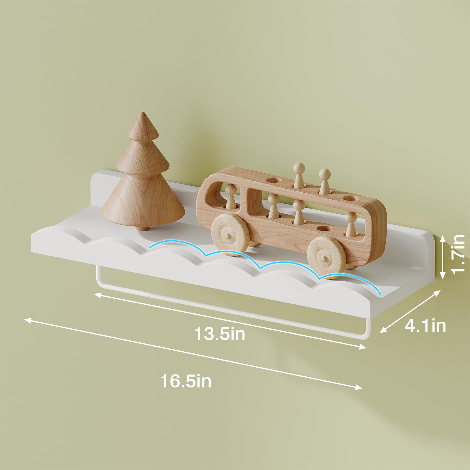- These floating nursery bookshelves add both style and storage functionality to any nursery or kids' room, making them a great addition to your home decor. In addition, towel rack can be used for children's clothing&bags&hair accessories storage.