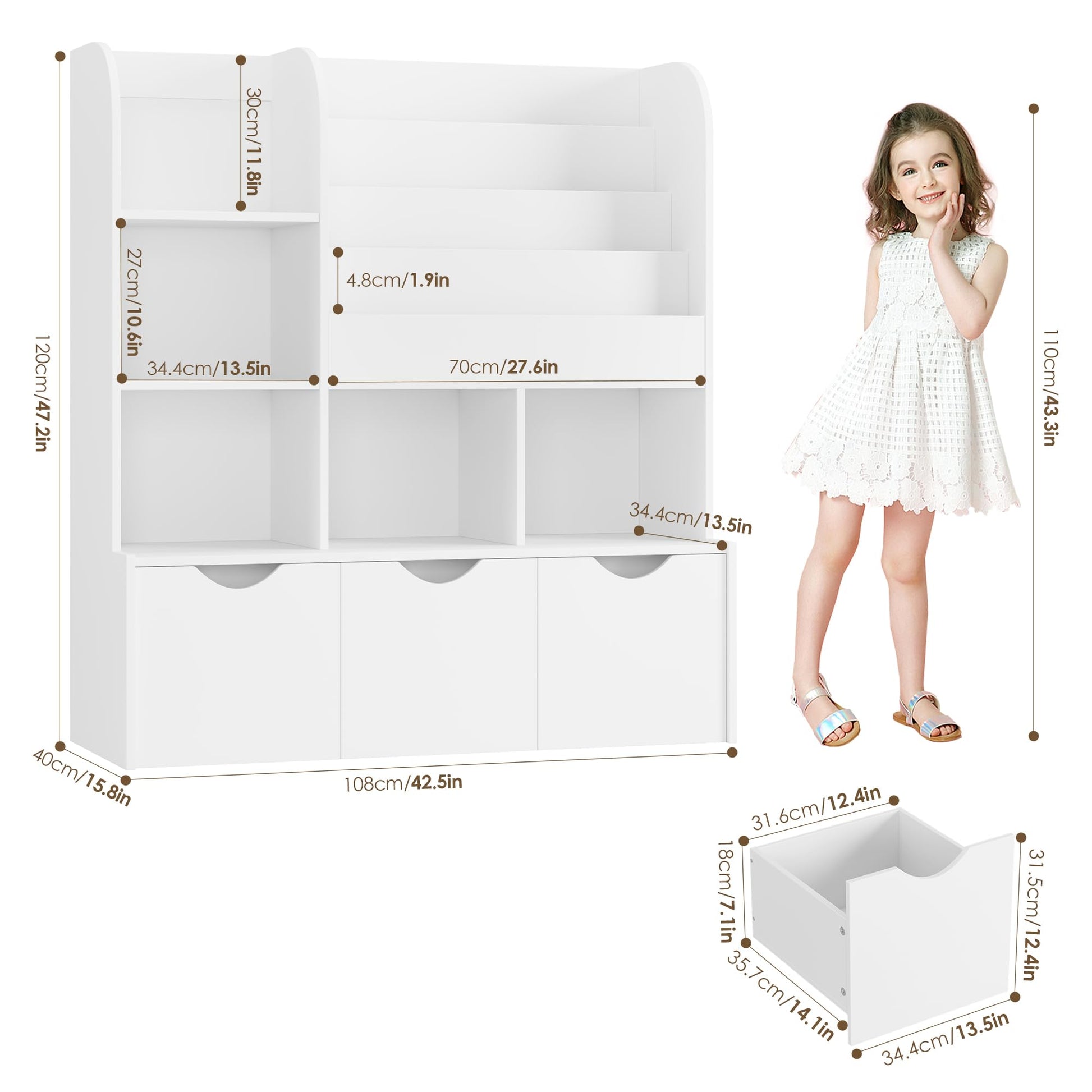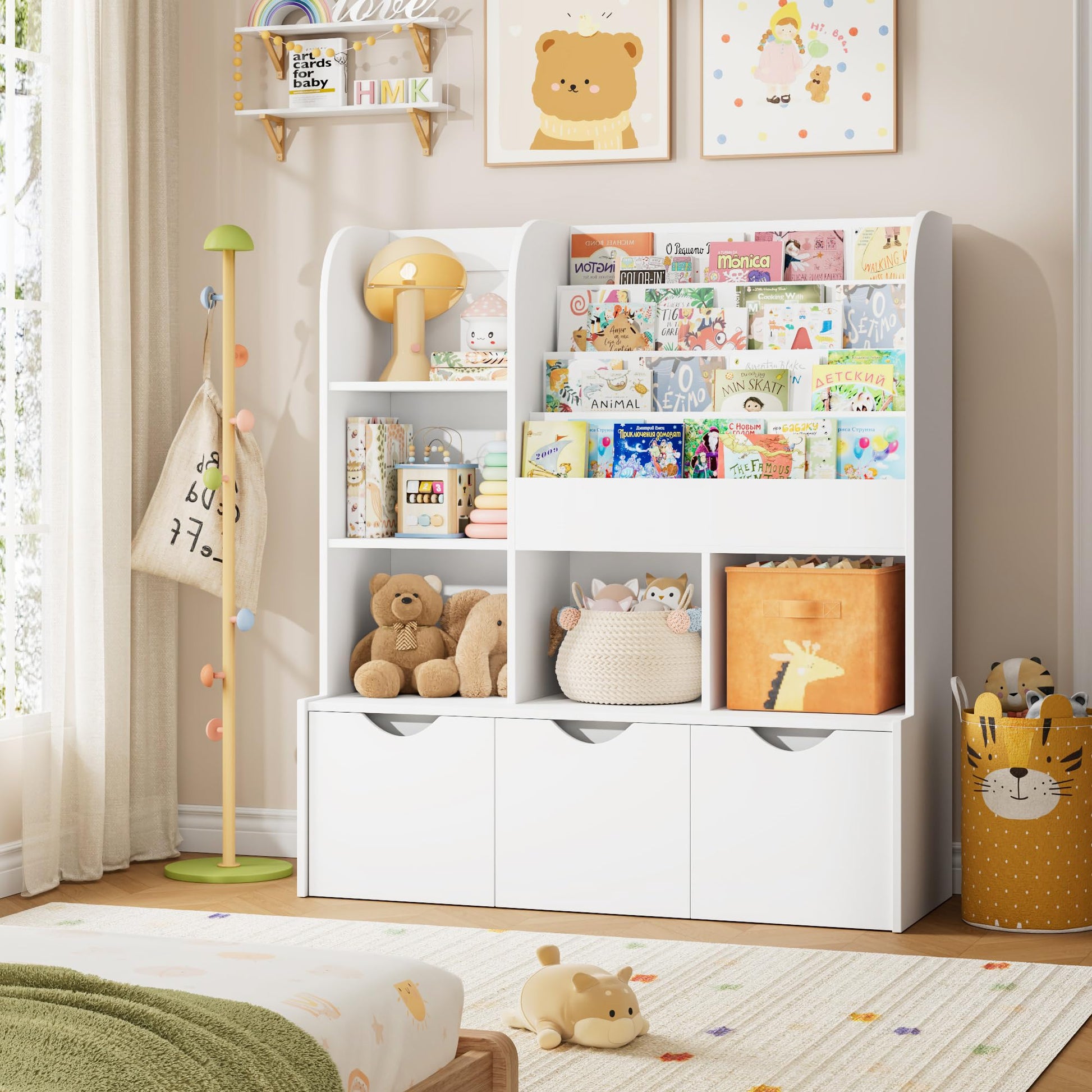 - Convenient: It can be used as a toy storage organizer, children's bookcase or simple storage cabinet. 3 movable drawers make it easy for your child to clean up scattered books, small toys and clutter.