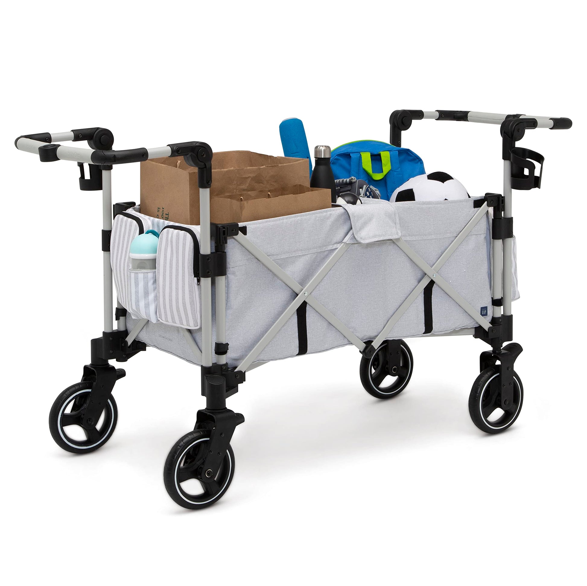 Details: Introducing the babyGap Deluxe Explorer Wagon by Delta Children: The most responsibly made wagon. Designed for the future in every possible way, all the soft fabric is made from recycled water bottles. Plastic drinking bottles are sorted, cleaned and shredded into flakes that become the yarn the seat fabric is made from. A great choice for your child and the planet, this versatile wagon features two cushioned seats with three-point safety harnesses for security while the removable center console with two cup holders and storage pocket allows kids to share snacks, toys and drinks. Two additional cup holders for parents and side pockets ensure you can bring everything you need along for the adventure. The removable, UV blocking canopy and roll-down shades offer privacy and protection from the sun or rain. Easy to drive, it features swivel front wheels that allow you to effortlessly turn and pivot, as well as push and pull leatherette handles with adjustable heights. The wagon’s compact fold makes it easy to store or transport. And when your children outgrow the need for a wagon, use it to haul your own gear at the farmers market, while gardening or the grocery store. Holds up to 110 lbs. (55 lbs. per seat). Weighs 38 lbs. Recommended for ages 9 months up to 55 lbs.