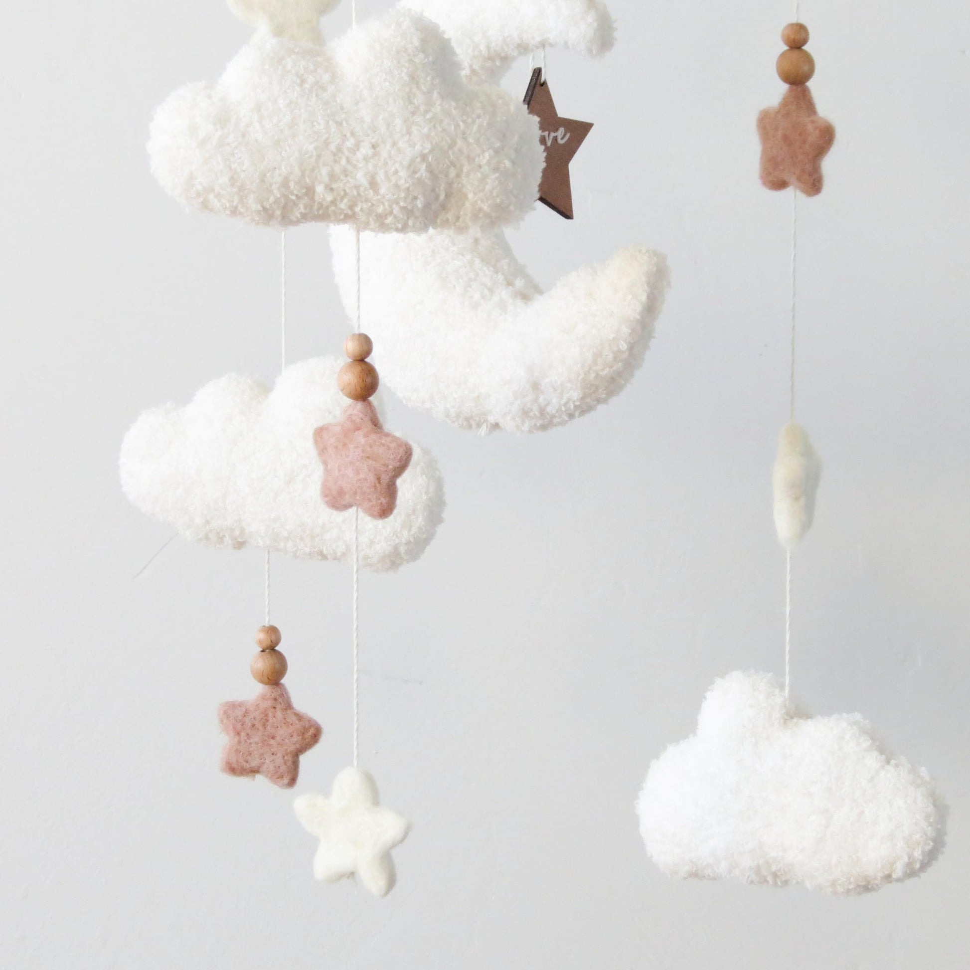 - Neutral Baby Mobile made with micro boucle fabric. A central moon with a personalised wooden star is surrounded by 3 clouds, all in boucle. Felted stars and wooden beads decorate the strings. We are committed to quality products please contact us if you have any questions.GOUKURLSMA