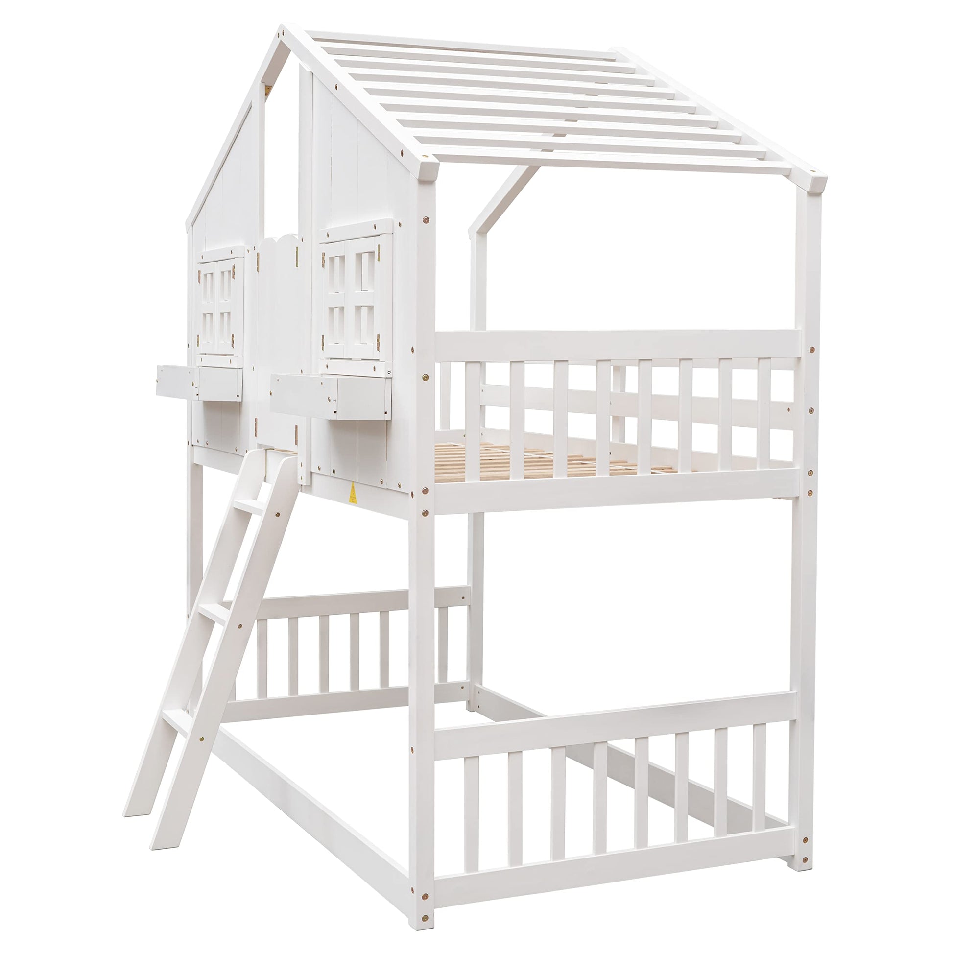 - This bunk bed twin over twin featuring windows,door,ladder,provides your kids with endless imagination and access to the natural woods, while they go to bed and fall asleep. They can put various decorations and accessories on the window boxes to accompany their whole sleep and daily activities.