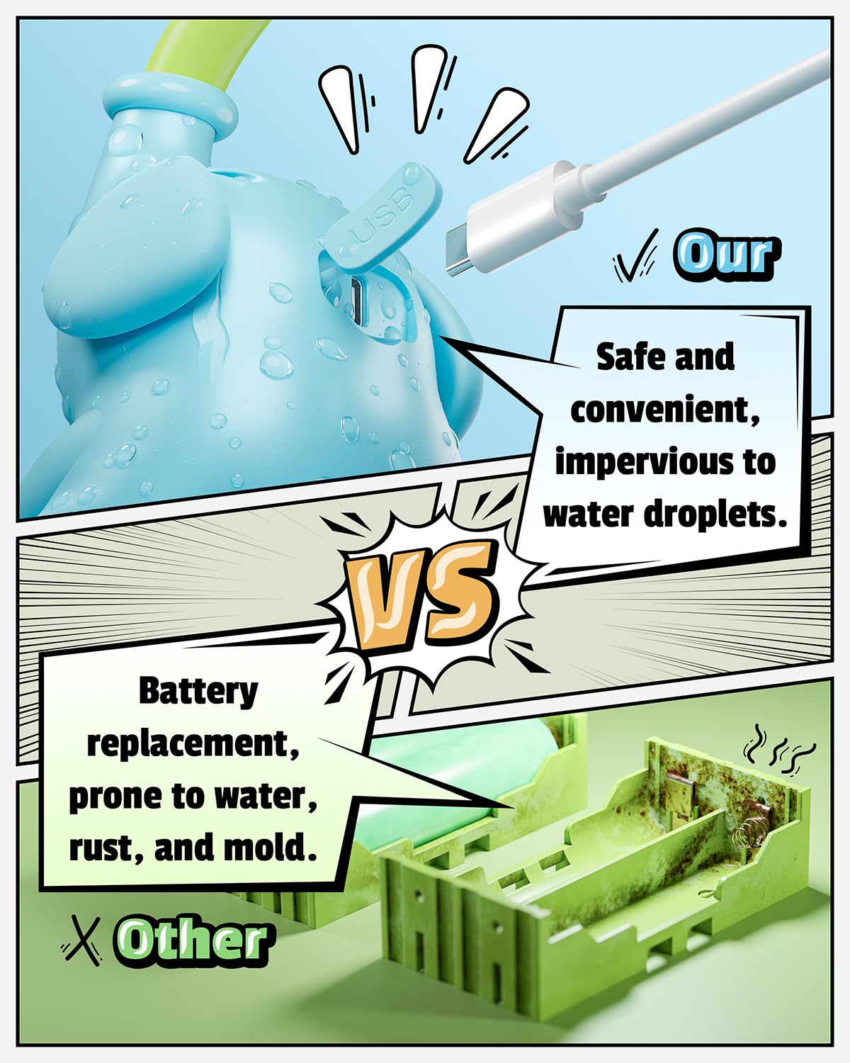 - Our bathtub toys use a newly upgraded splash-proof USB charging method, allowing for safe charging even if there are water residues in the charging port. This solves the problem of battery compartments in other products getting wet, rusty, or moldy, eliminating safety hazards