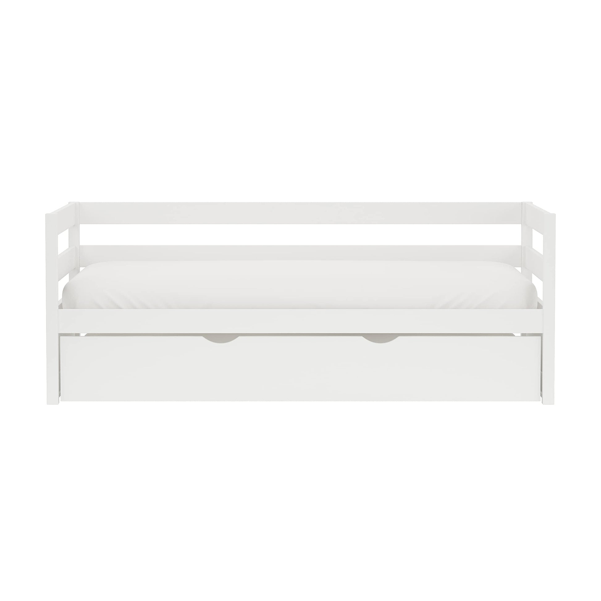 - Modest slat style wood twin size daybed with easy to roll out twin trundle