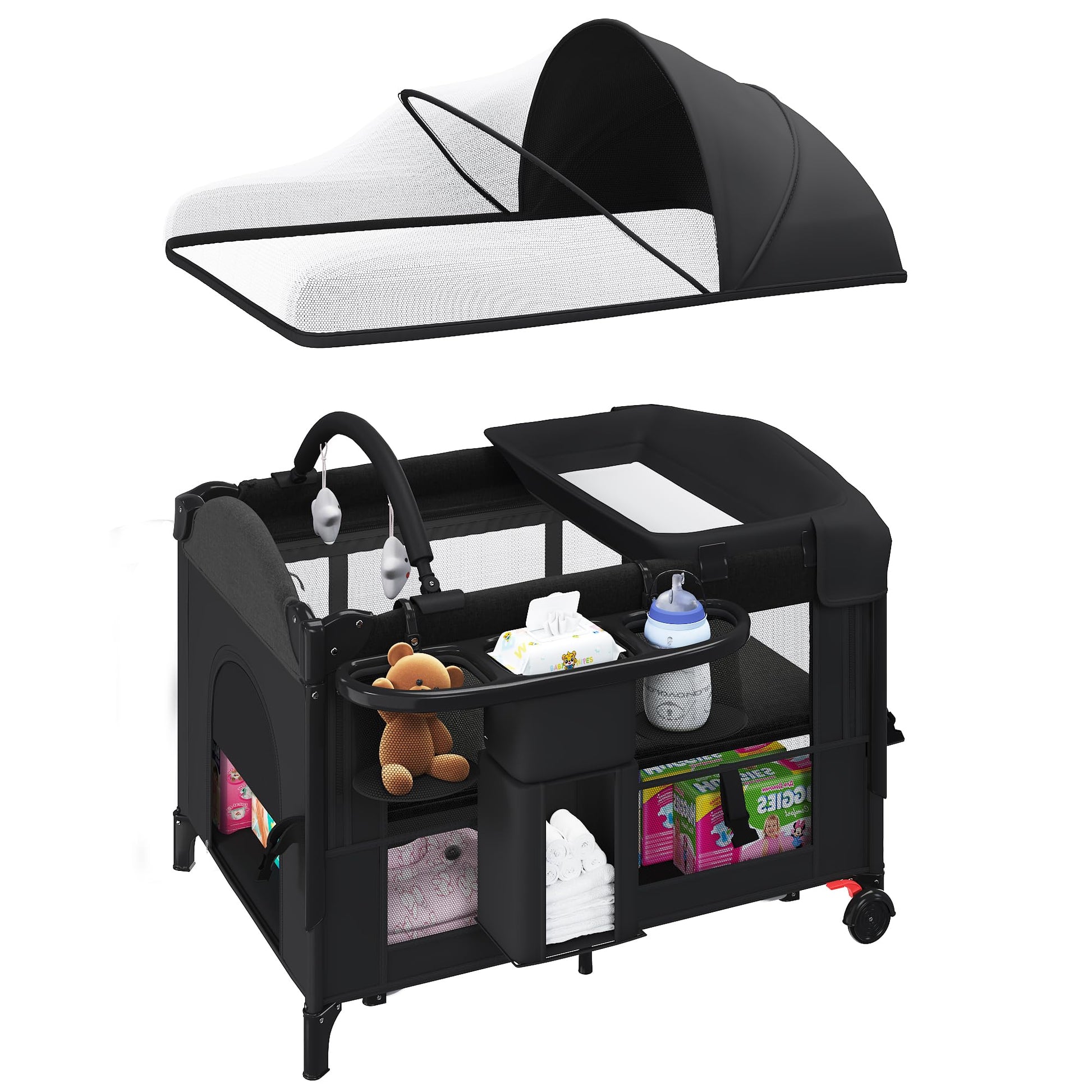 - The baby bassinet is designed with multi-functionality, the base is equipped with a swinging tube, which can be pulled out to transform into a cradle.Featuring a waterproof and easy-to-clean changing table with sponge and MDF padding, and a half-mesh mosquito net to protect your baby from insects.Versatile storage solution accommodates toys, bottles, and more, making every changing moment efficient and stress-free