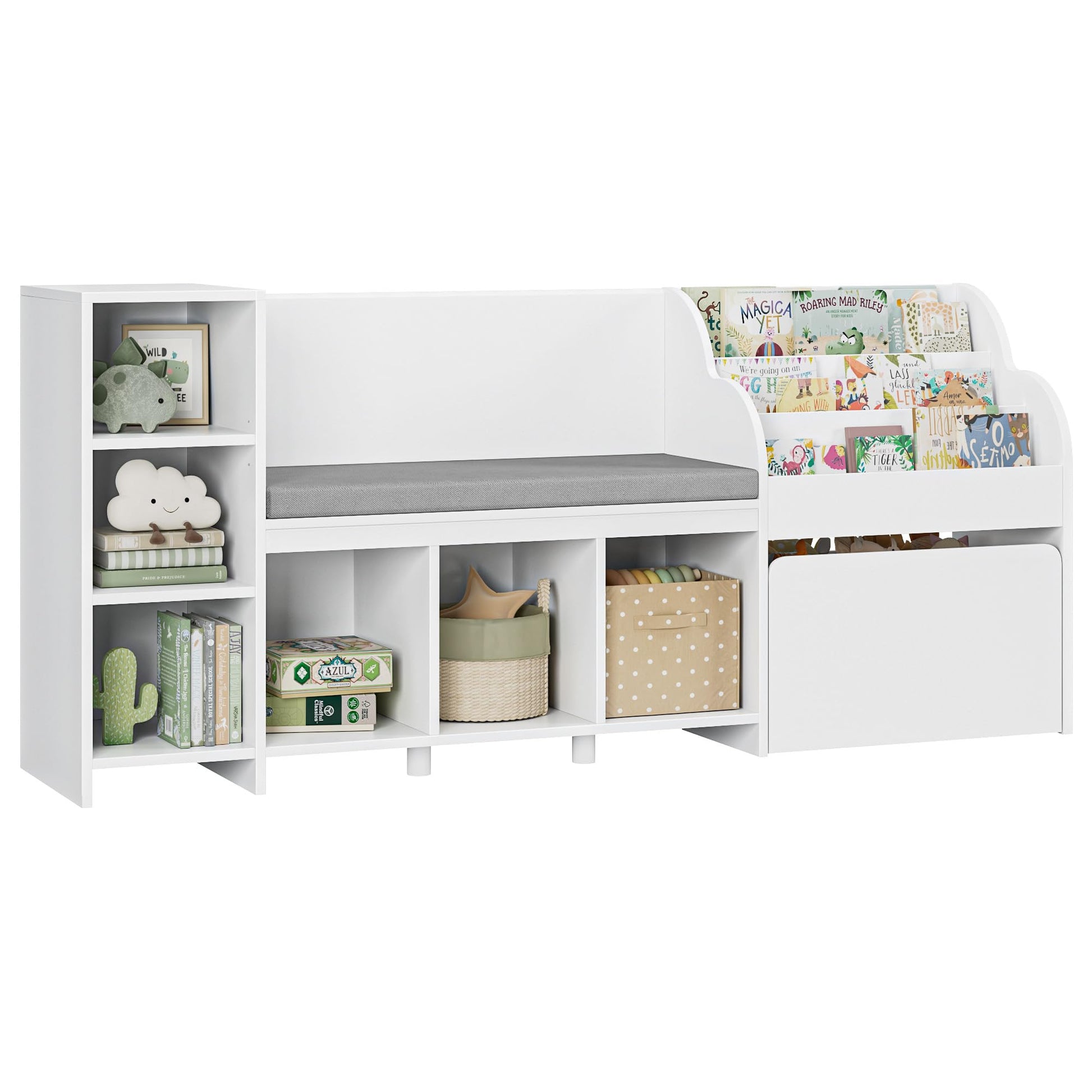 67" Kids Reading Nook with Bench, Kids Bookshelf and Bookcase s, Toy Storage Box on Wheels, Toy Chest for Playroom, Bedroom, School, White