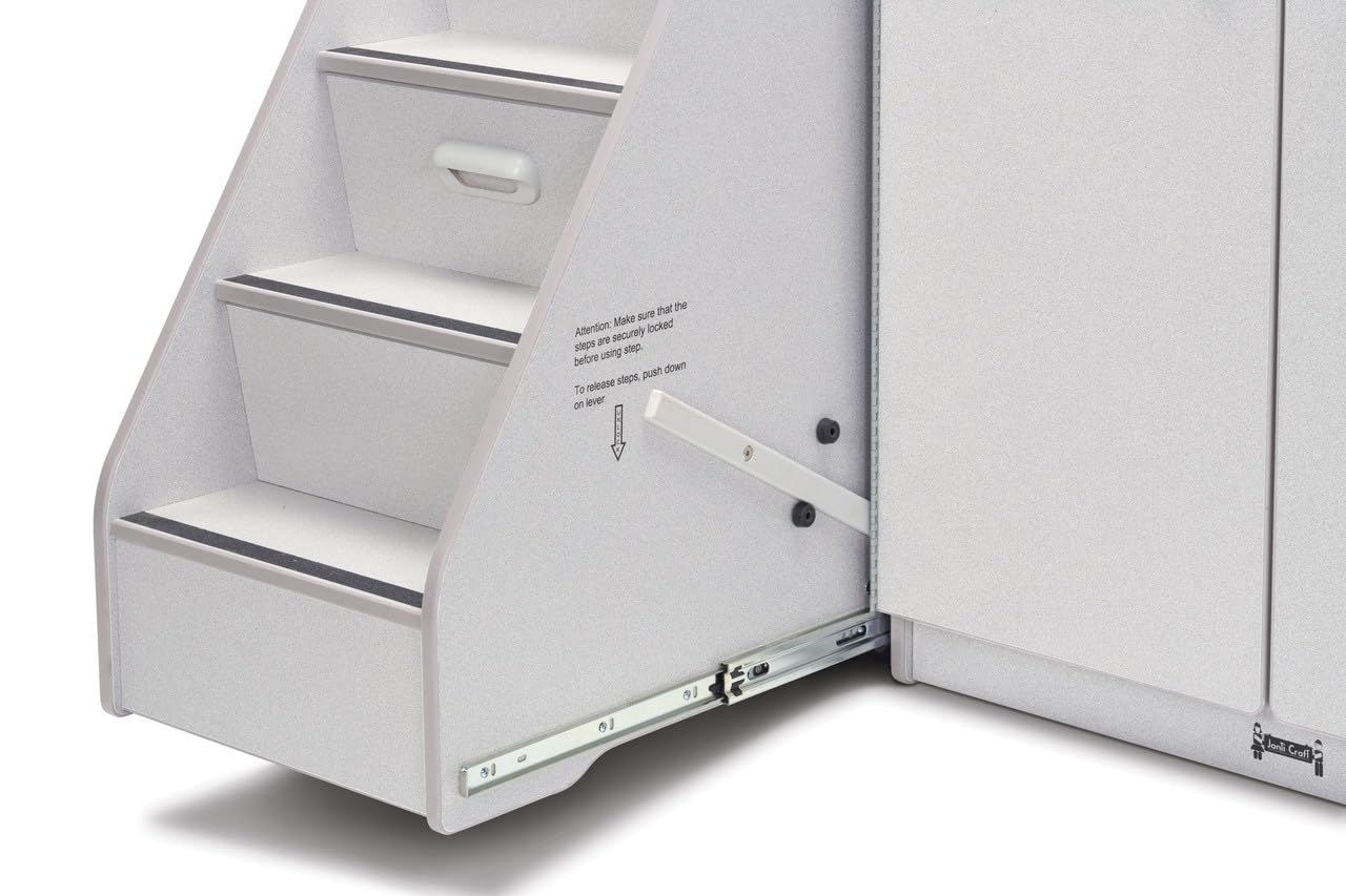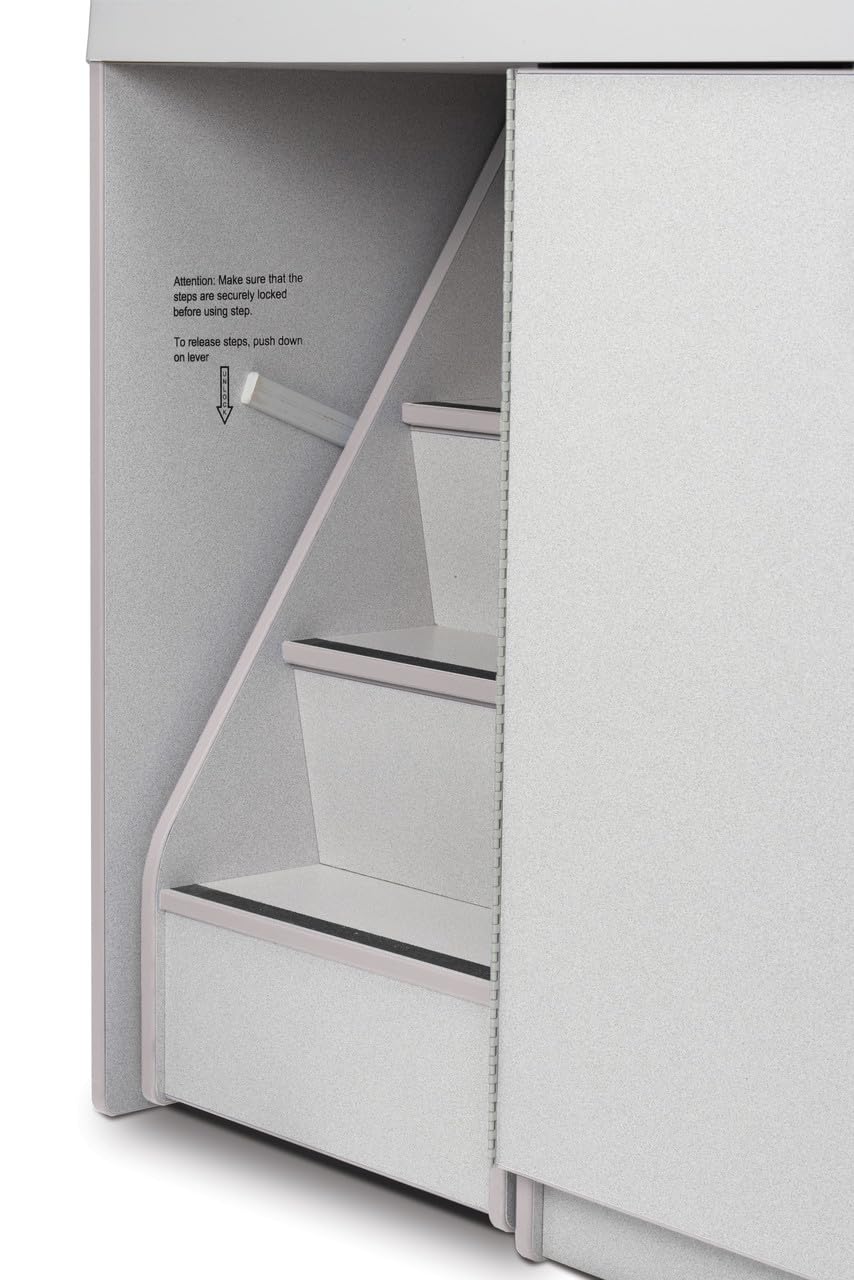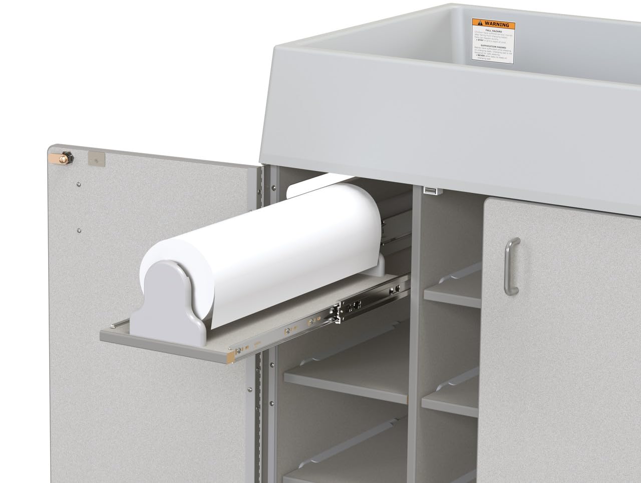 - PULL OUT STAIRS & STORAGE - Our changing table has pull-out stairs that conveniently glide under the table when not in use. The pull-out paper dispenser is easy to refill. Includes 11 colored Cubbie-Trays located behind secured doors for safety.