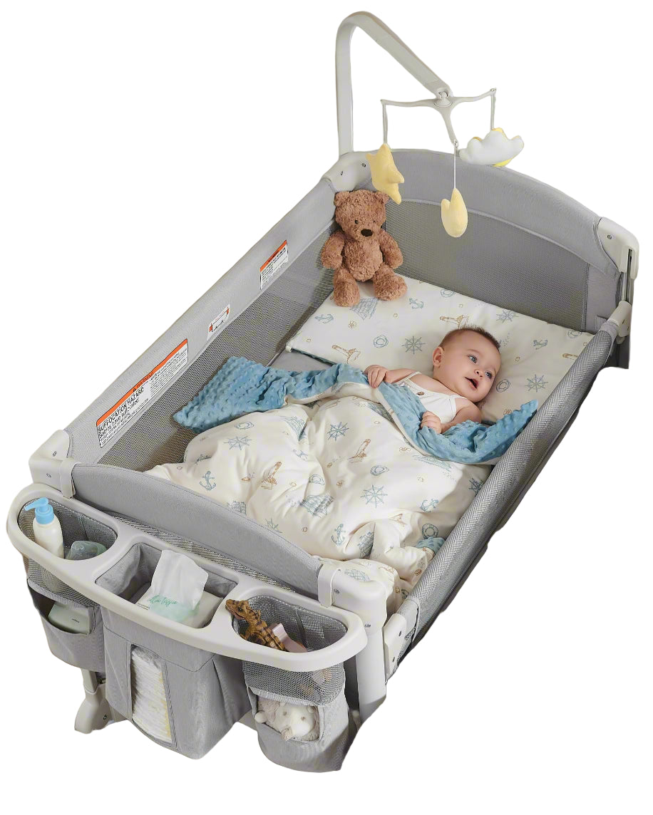 - JOYBAI 4-in-1 Bedside Sleeper: The Ultimate Baby Care Solution, thoughtfully designed to meet all your baby’s needs. From nighttime cuddles in the bedside crib to seamless diaper changes with the portable changing table, every feature is crafted for convenience. The secure bassinet ensures peaceful naps, while the playard mode creates a safe haven for play and relaxation. Engaging hanging toys with built-in bells captivate your baby, sparking their curiosity and soothing their senses. Perfectly blending functionality and comfort, this all-in-one solution grows with your baby, making everyday family life easier and more joyful.
